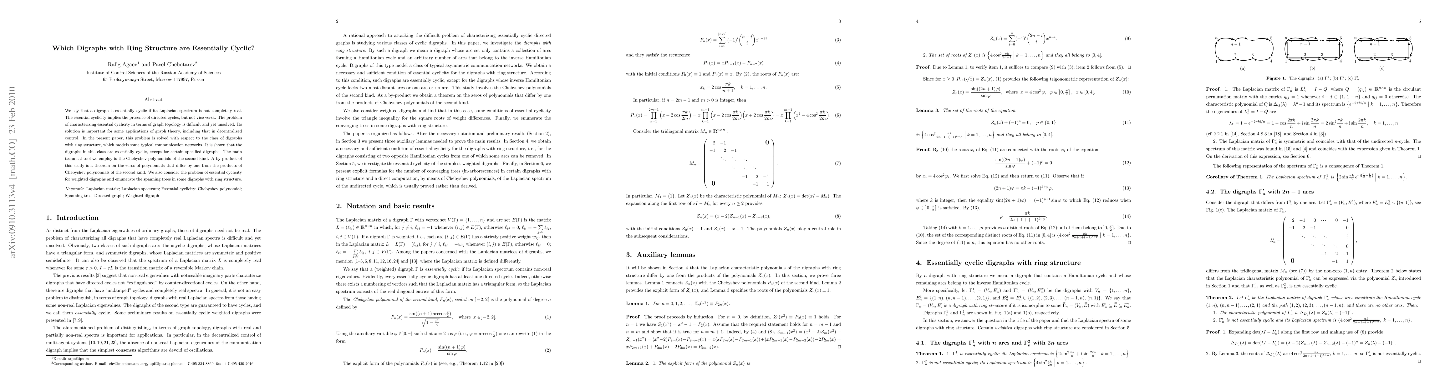 We say that a digraph is essentially cyclic if its Laplacian spectrum is not completely real. The essential cyclicity implies the presence of directed cycles, but not vice versa. The problem of characterizing essential cyclicity in terms of graph topology is difficult and yet unsolved. Its solution is important for some applications of graph theory, including that in decentralized control. In the present paper, this problem is solved with respect to the class of digraphs with ring structure, which models some typical communication networks. It is shown that the digraphs in this class are essentially cyclic, except for certain specified digraphs. The main technical tool we employ is the Chebyshev polynomials of the second kind. A by-product of this study is a theorem on the zeros of polynomials that differ by one from the products of Chebyshev polynomials of the second kind. We also consider the problem of essential cyclicity for weighted digraphs and enumerate the spanning trees in some digraphs with ring structure.