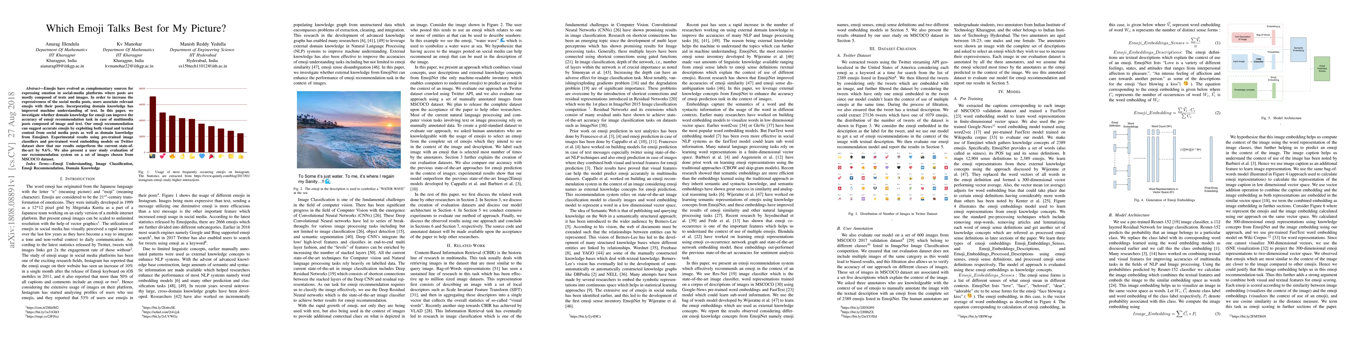 Emojis have evolved as complementary sources for expressing emotion in social-media platforms where posts are mostly composed of texts and images. In order to increase the expressiveness of the social media posts, users associate relevant emojis with their posts. Incorporating domain knowledge has improved machine understanding of text. In this paper, we investigate whether domain knowledge for emoji can improve the accuracy of emoji recommendation task in case of multimedia posts composed of image and text. Our emoji recommendation can suggest accurate emojis by exploiting both visual and textual content from social media posts as well as domain knowledge from Emojinet. Experimental results using pre-trained image classifiers and pre-trained word embedding models on Twitter dataset show that our results outperform the current state-of-the-art by 9.6\%. We also present a user study evaluation of our recommendation system on a set of images chosen from MSCOCO dataset.