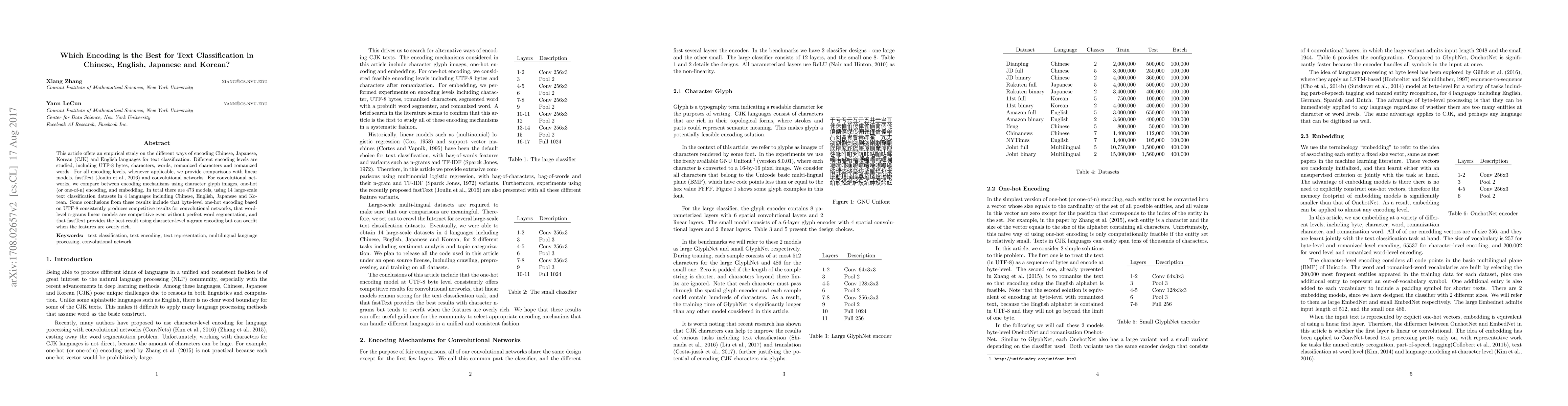 This article offers an empirical study on the different ways of encoding Chinese, Japanese, Korean (CJK) and English languages for text classification. Different encoding levels are studied, including UTF-8 bytes, characters, words, romanized characters and romanized words. For all encoding levels, whenever applicable, we provide comparisons with linear models, fastText and convolutional networks. For convolutional networks, we compare between encoding mechanisms using character glyph images, one-hot (or one-of-n) encoding, and embedding. In total there are 473 models, using 14 large-scale text classification datasets in 4 languages including Chinese, English, Japanese and Korean. Some conclusions from these results include that byte-level one-hot encoding based on UTF-8 consistently produces competitive results for convolutional networks, that word-level n-grams linear models are competitive even without perfect word segmentation, and that fastText provides the best result using character-level n-gram encoding but can overfit when the features are overly rich.