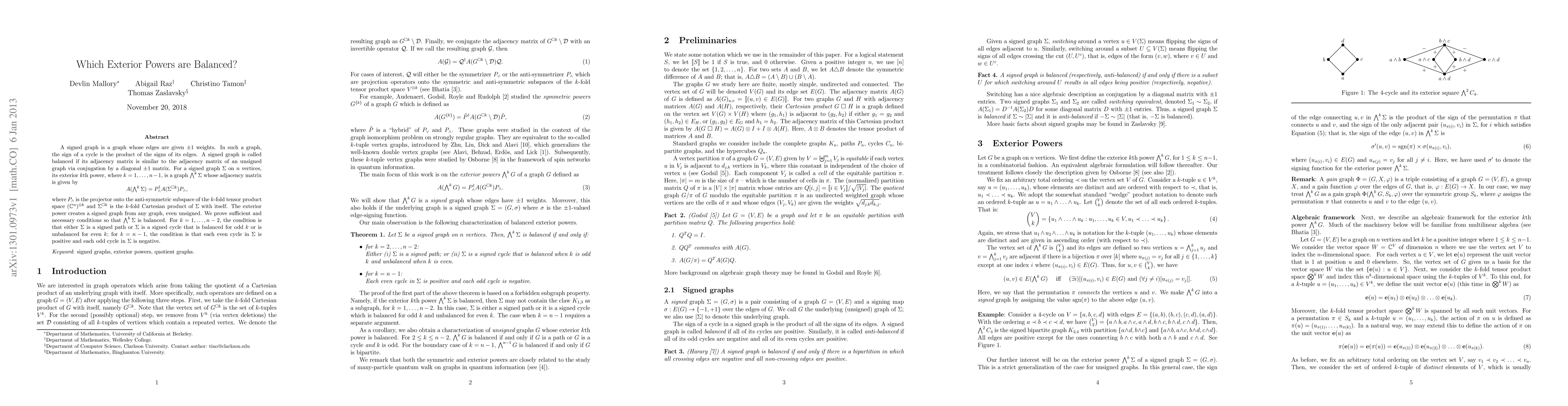 A signed graph is a graph whose edges are given (-1,+1) weights. In such a graph, the sign of a cycle is the product of the signs of its edges. A signed graph is called balanced if its adjacency matrix is similar to the adjacency matrix of an unsigned graph via conjugation by a diagonal (-1,+1) matrix. For a signed graph $\Sigma$ on n vertices, its exterior k-th power, where k=1,..,n-1, is a graph $\bigwedge^{k} \Sigma$ whose adjacency matrix is given by \[ A({$\bigwedge^{k} {\Sigma}$}) = P^{\dagger} A(\Sigma^{\Box k}) P, \] where P is the projector onto the anti-symmetric subspace of the k-fold tensor product space $(\mathbb{C}^{n})^{\otimes k}$ and $\Sigma^{\Box k}$ is the k-fold Cartesian product of $\Sigma$ with itself. The exterior power creates a signed graph from any graph, even unsigned. We prove sufficient and necessary conditions so that $\bigwedge^{k} \Sigma$ is balanced. For k=1,..,n-2, the condition is that either $\Sigma$ is a signed path or $\Sigma$ is a signed cycle that is balanced for odd k or is unbalanced for even k; for k=n-1, the condition is that each even cycle in $\Sigma$ is positive and each odd cycle in $\Sigma$ is negative.