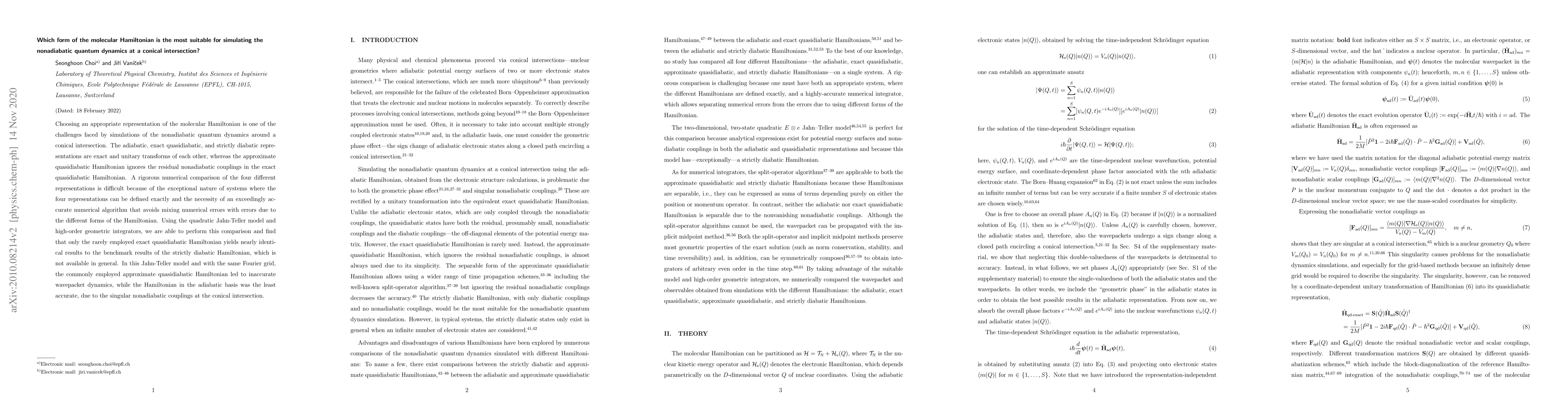 This paper investigates the suitability of different forms of the molecular Hamiltonian for simulating nonadiabatic quantum dynamics at a conical intersection, finding that the exact quasidiabatic Hamiltonian provides the most accurate results, while the adiabatic and approximate quasidiabatic forms are less reliable.