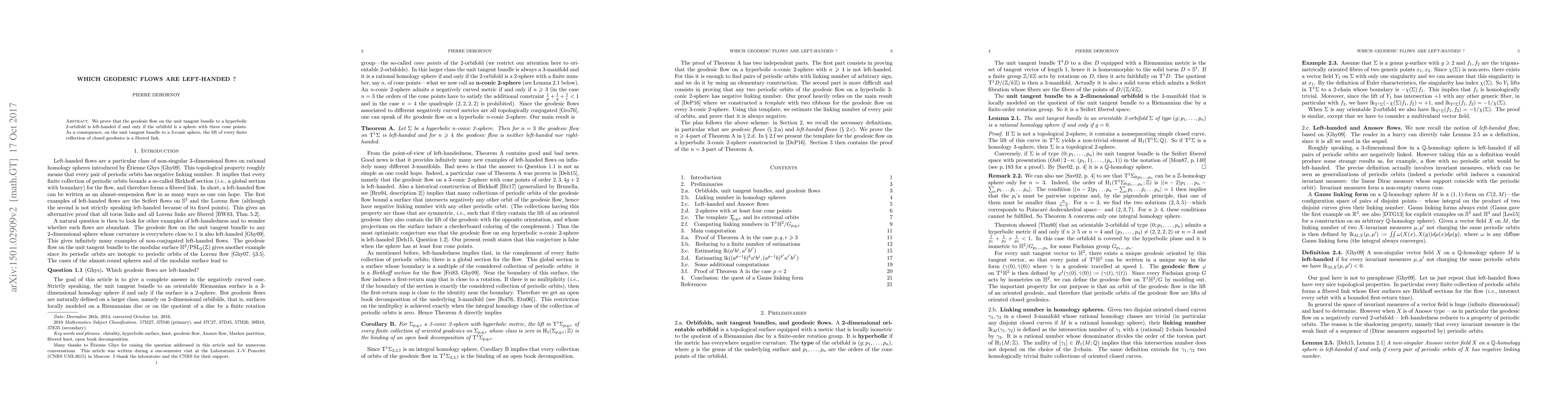 We prove that the geodesic flow on the unit tangent bundle to a hyperbolic 2-orbifold is left-handed if and only if the orbifold is a sphere with three conic points. As a consequence, on the unit tangent bundle to a 3-conic sphere, the lift of every finite collection of closed geodesics that is zero in integral homology is the binding of an open book decomposition.