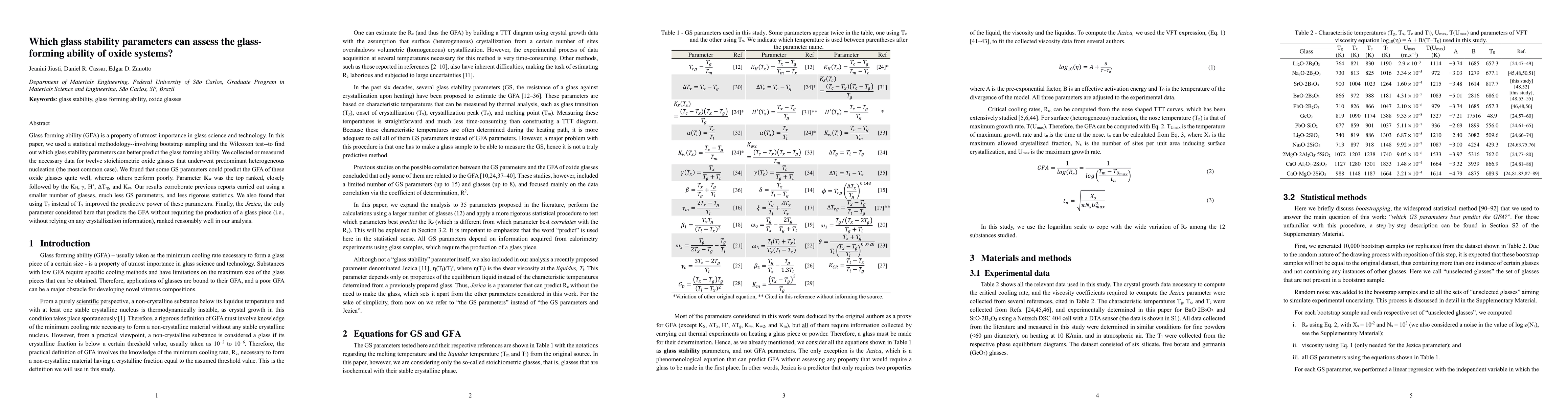 This study uses statistical methods to identify key glass stability parameters that predict glass-forming ability in oxide systems, finding $K_w$, $K_H$, $gamma$, $H^{'}$, $Delta T_{rg}$, and $K_{cr}$ as top predictors. The research also suggests using $T_c$ over $T_x$ and highlights the Jezica parameter for its ability to predict GFA without needing crystallization data.