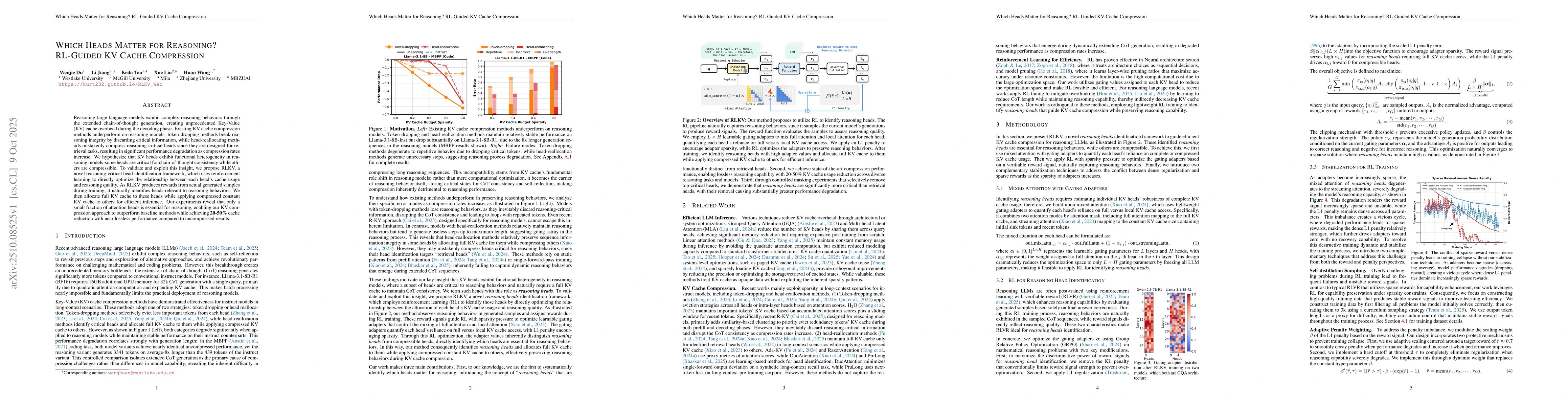 The paper introduces a reinforcement learning-based approach to identify and prioritize reasoning heads in transformer models, enabling efficient KV cache optimization without significant performance degradation.