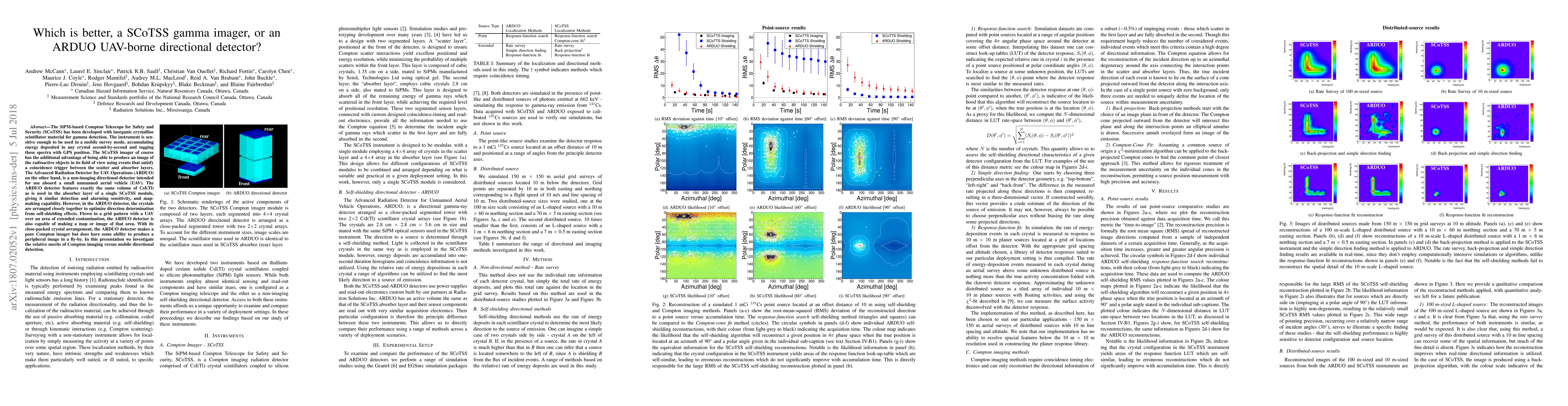 This paper compares the SCoTSS gamma imager, which uses a SiPM-based Compton Telescope for imaging radioactive objects, with the ARDUO UAV-borne directional detector, which uses a closely packed CsI(Tl) crystal arrangement for mapping contamination. The study evaluates the relative merits of Compton imaging versus mobile directional detection for safety and security applications.