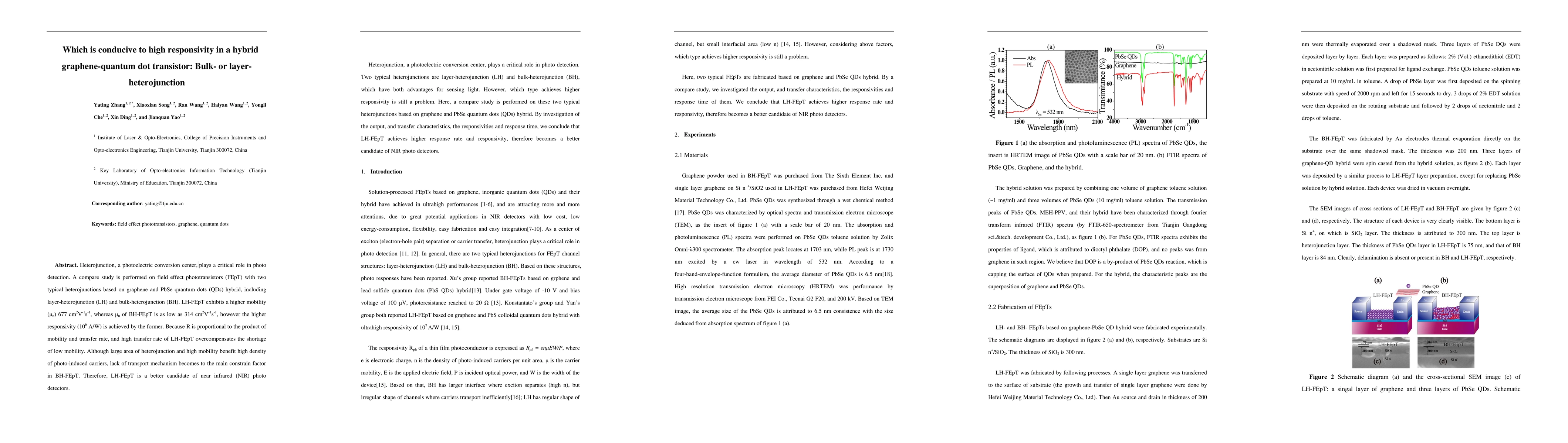 This study compares the responsivity of hybrid graphene-PbSe quantum dot transistors with layer-heterojunction (LH) and bulk-heterojunction (BH) configurations, finding LH-FEpT has higher responsivity due to a higher transfer rate despite lower mobility, making it superior for NIR photo detection.