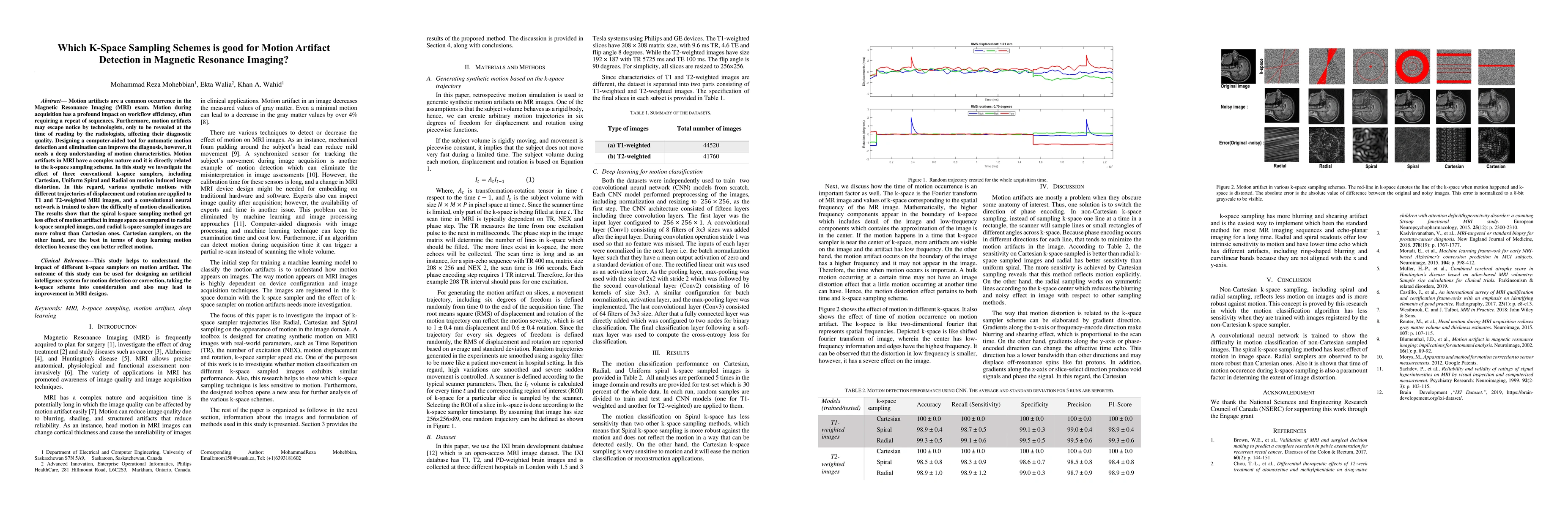 Researchers investigated the effect of different k-space sampling schemes on motion artifacts in MRI images, finding that spiral samplers produce less distortion than radial samplers, while Cartesian samplers perform best for deep learning-based motion detection.
