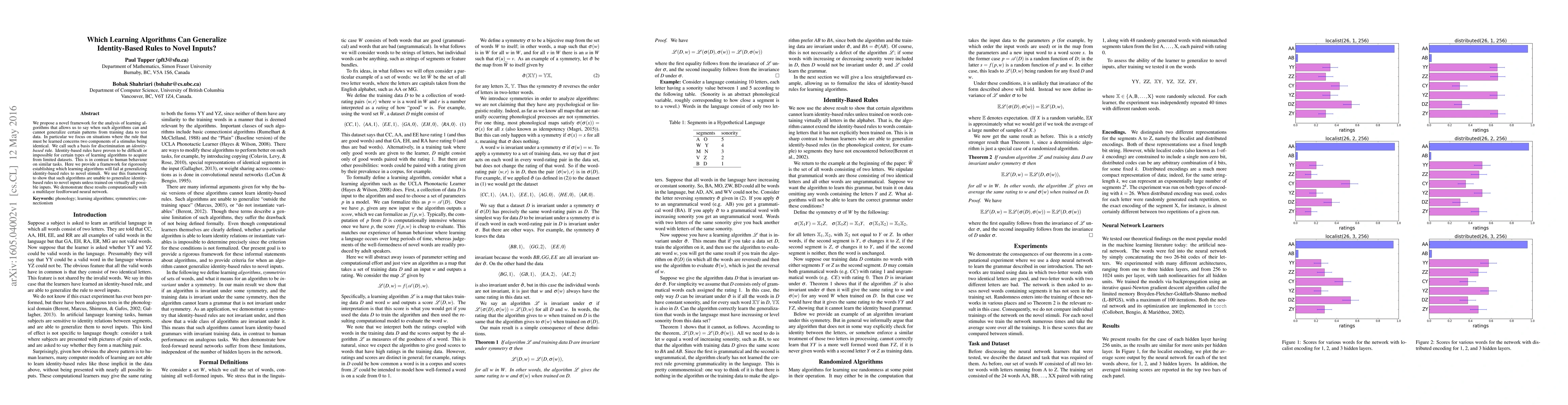 We propose a novel framework for the analysis of learning algorithms that allows us to say when such algorithms can and cannot generalize certain patterns from training data to test data. In particular we focus on situations where the rule that must be learned concerns two components of a stimulus being identical. We call such a basis for discrimination an identity-based rule. Identity-based rules have proven to be difficult or impossible for certain types of learning algorithms to acquire from limited datasets. This is in contrast to human behaviour on similar tasks. Here we provide a framework for rigorously establishing which learning algorithms will fail at generalizing identity-based rules to novel stimuli. We use this framework to show that such algorithms are unable to generalize identity-based rules to novel inputs unless trained on virtually all possible inputs. We demonstrate these results computationally with a multilayer feedforward neural network.