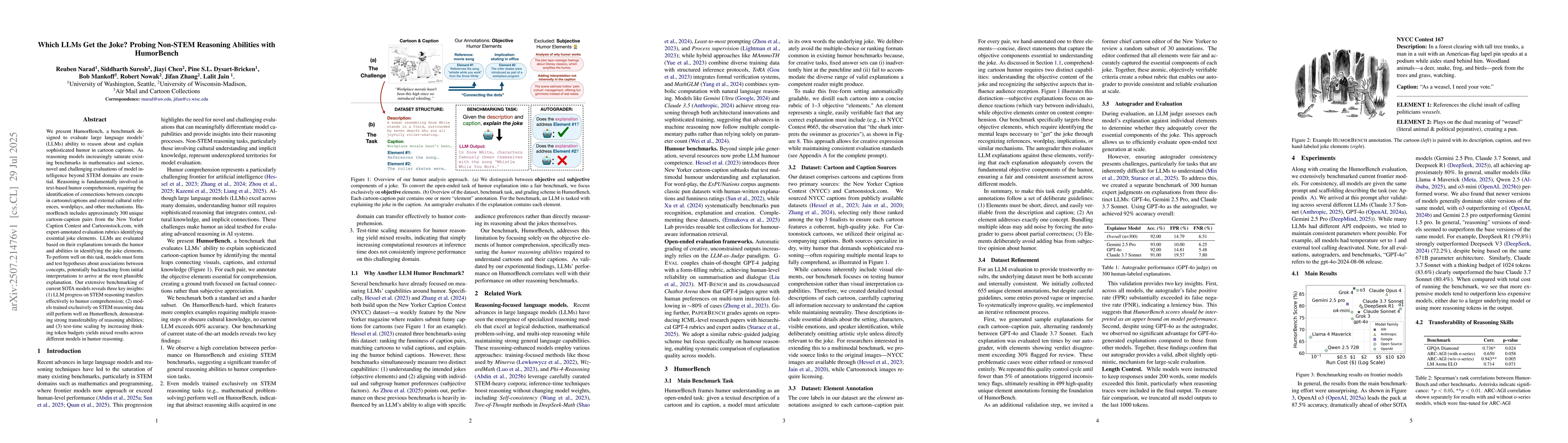 HumorBench, a benchmark for evaluating large language models' (LLMs) ability to reason about and explain sophisticated humor in cartoon captions, was developed. The benchmark includes 300 unique cartoon-caption pairs with expert-annotated evaluation rubrics identifying essential joke elements.