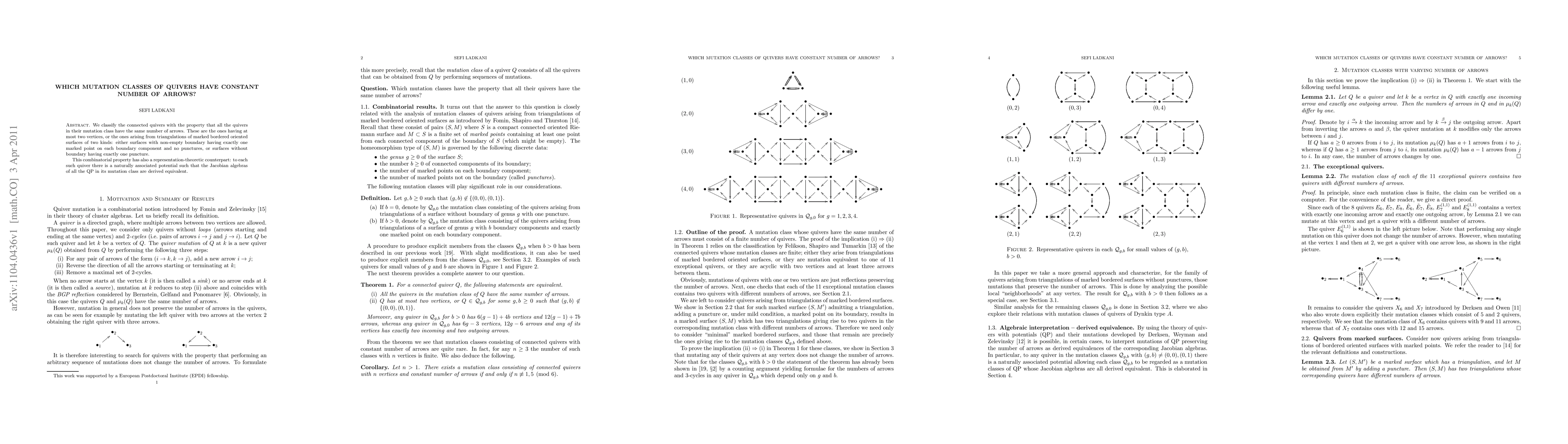 We classify the connected quivers with the property that all the quivers in their mutation class have the same number of arrows. These are the ones having at most two vertices, or the ones arising from triangulations of marked bordered oriented surfaces of two kinds: either surfaces with non-empty boundary having exactly one marked point on each boundary component and no punctures, or surfaces without boundary having exactly one puncture. This combinatorial property has also a representation-theoretic counterpart: to each such quiver there is a naturally associated potential such that the Jacobian algebras of all the QP in its mutation class are derived equivalent.