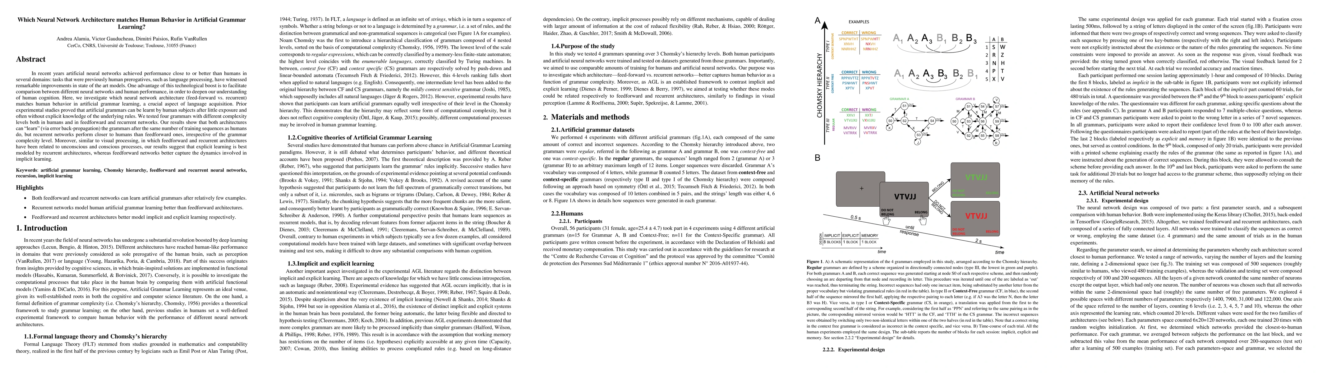 Researchers compared neural network architectures to human behavior in learning artificial grammar rules. Recurrent networks better matched human performance than feedforward networks.