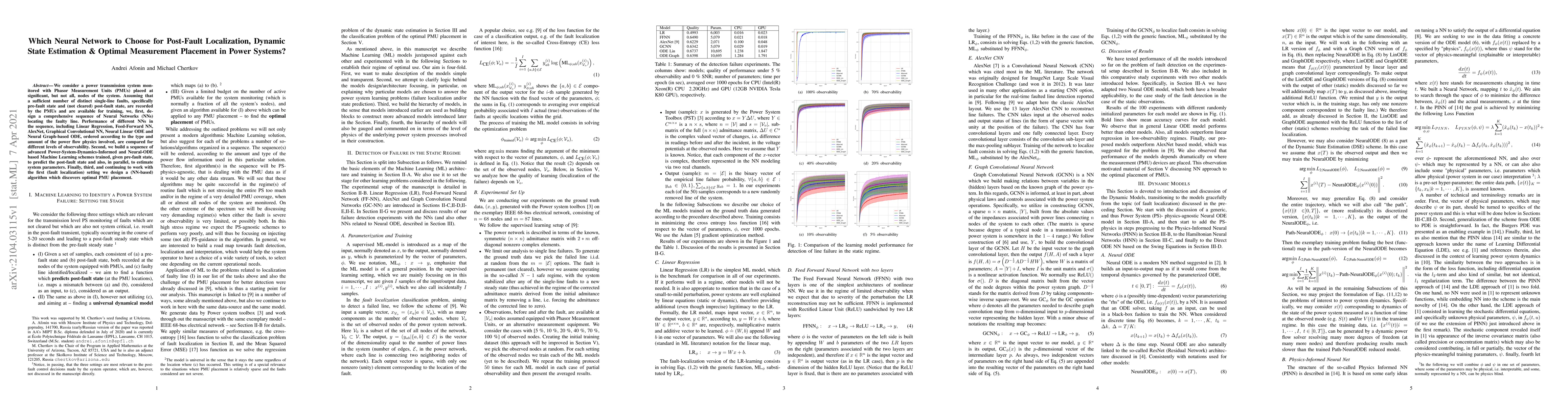 This research paper compares different neural networks for post-fault localization, dynamic state estimation, and optimal measurement placement in power systems, with key findings focusing on the performance of various machine learning schemes under different levels of observability.