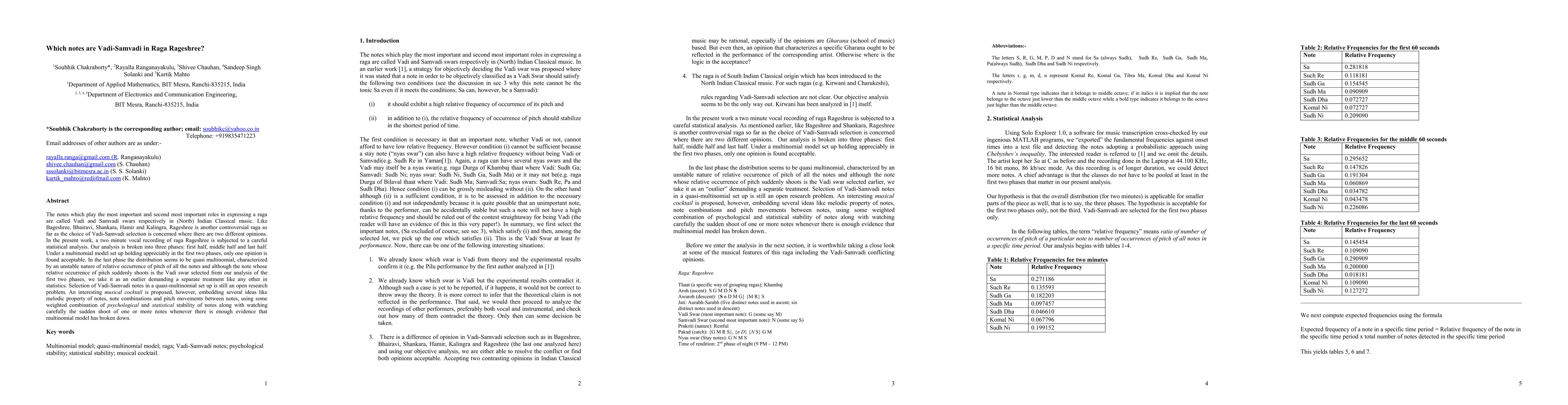 This paper investigates the Vadi-Samvadi notes in Raga Rageshree through statistical analysis of a vocal recording, finding that only one opinion holds in the first two phases, while the last phase presents a quasi-multinomial distribution. The study proposes a method for selecting Vadi-Samvadi notes considering psychological and statistical stability, and the sudden prominence of certain notes.