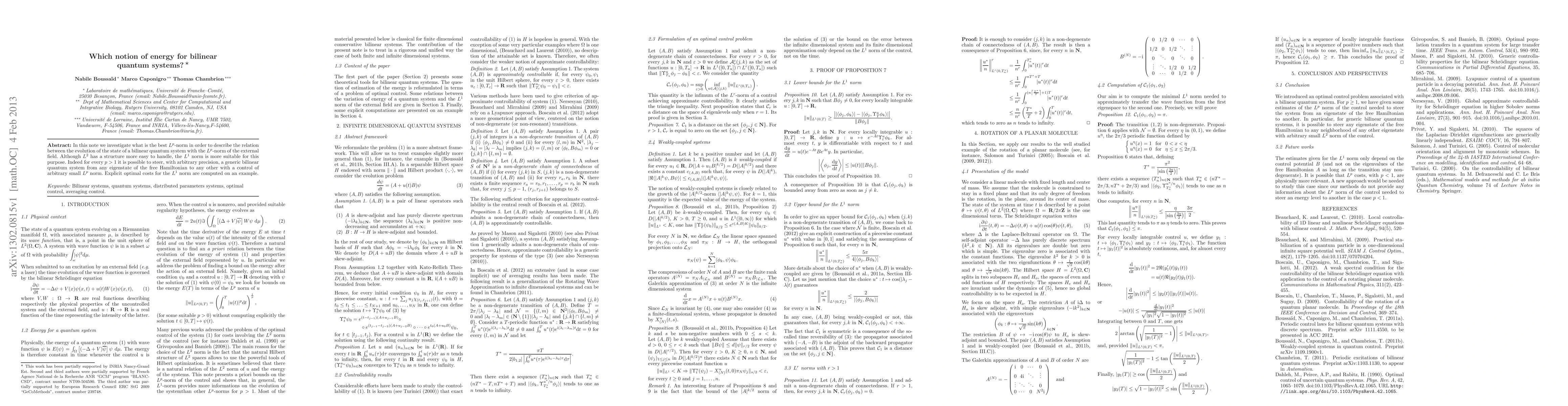 In this note we investigate what is the best L^p-norm in order to describe the relation between the evolution of the state of a bilinear quantum system with the L^p-norm of the external field. Although L^2 has a structure more easy to handle, the L^1 norm is more suitable for this purpose. Indeed for every p>1, it is possible to steer, with arbitrary precision, a generic bilinear quantum system from any eigenstate of the free Hamiltonian to any other with a control of arbitrary small L^p norm. Explicit optimal costs for the L^1 norm are computed on an example.