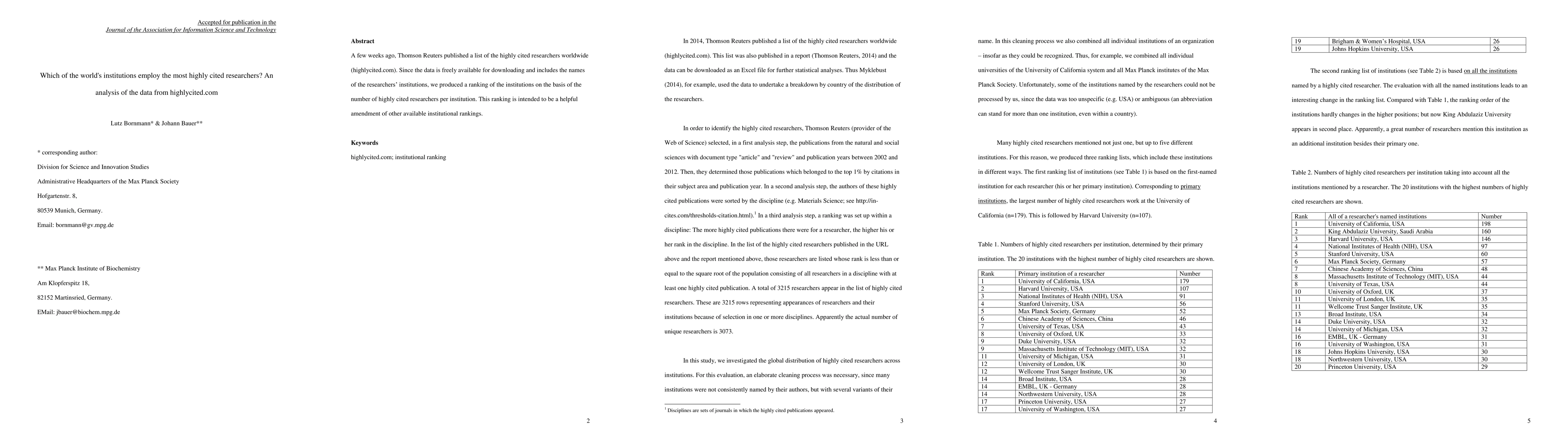 Summary: This study analyzes Thomson Reuters' list of highly cited researchers to identify which institutions employ the most of them, providing a ranking based on the number of highly cited researchers per institution. This ranking aims to supplement existing institutional rankings.