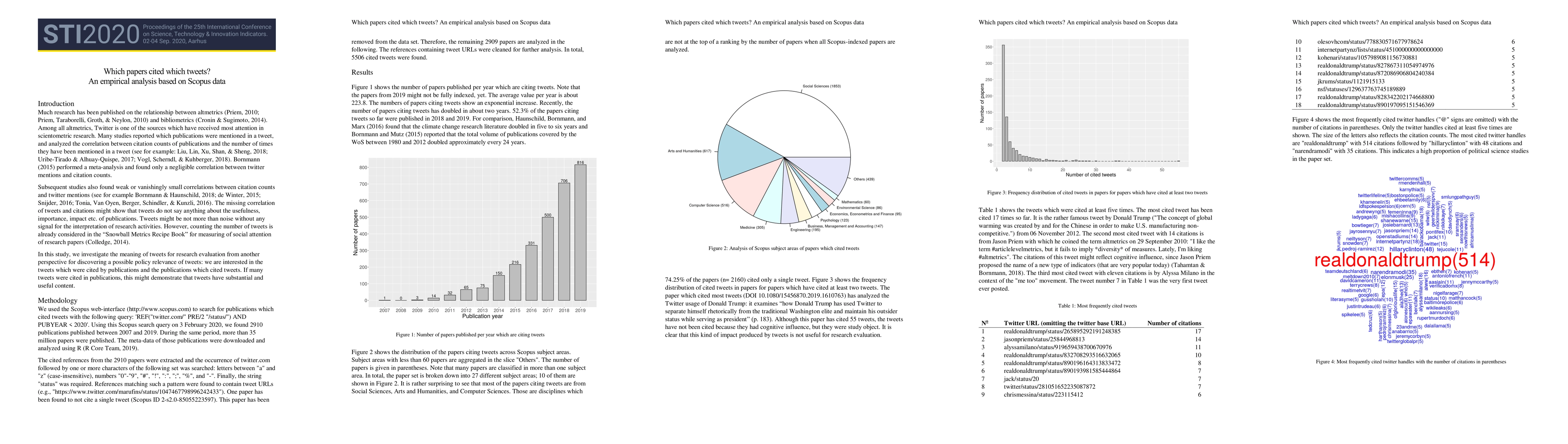 This study found that only a small number of tweets (5506) were cited in less than 3,000 papers, suggesting that tweets may not have substantial or policy-relevant content. The majority of citations came from social sciences, arts, and humanities fields.