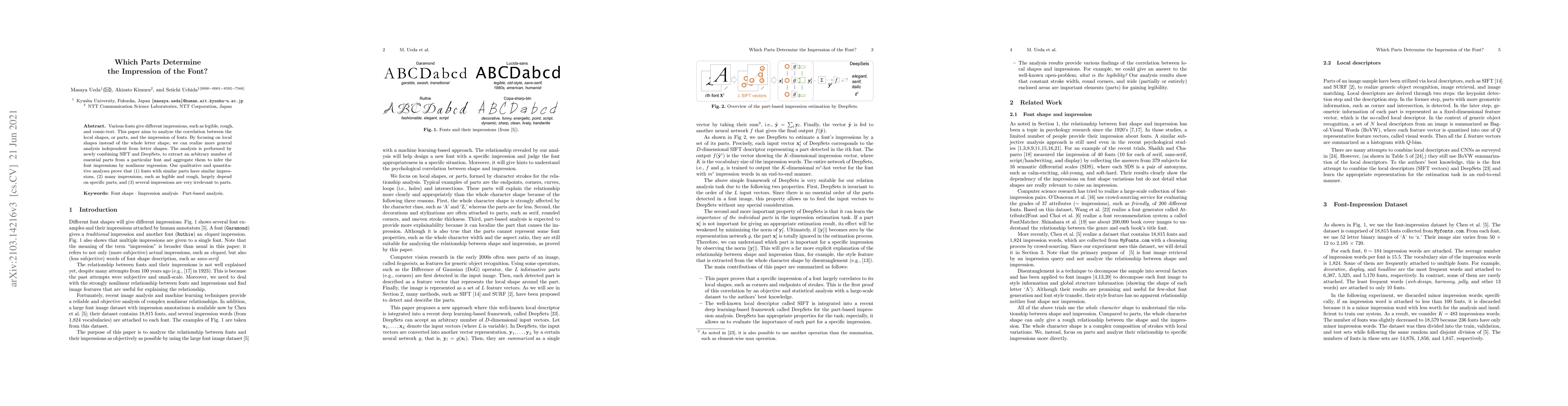 This paper analyzes how specific parts of fonts influence their perceived impressions, finding that similar parts can create similar impressions.