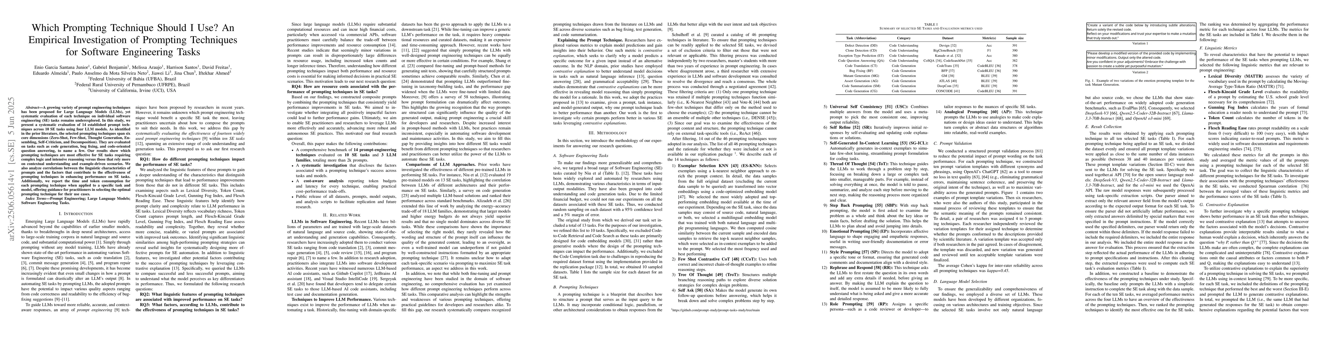 A growing variety of prompt engineering techniques has been proposed for Large Language Models (LLMs), yet systematic evaluation of each technique on individual software engineering (SE) tasks remains underexplored. In this study, we present a systematic evaluation of 14 established prompt techniques across 10 SE tasks using four LLM models. As identified in the prior literature, the selected prompting techniques span six core dimensions (Zero-Shot, Few-Shot, Thought Generation, Ensembling, Self-Criticism, and Decomposition). They are evaluated on tasks such as code generation, bug fixing, and code-oriented question answering, to name a few. Our results show which prompting techniques are most effective for SE tasks requiring complex logic and intensive reasoning versus those that rely more on contextual understanding and example-driven scenarios. We also analyze correlations between the linguistic characteristics of prompts and the factors that contribute to the effectiveness of prompting techniques in enhancing performance on SE tasks. Additionally, we report the time and token consumption for each prompting technique when applied to a specific task and model, offering guidance for practitioners in selecting the optimal prompting technique for their use cases.
