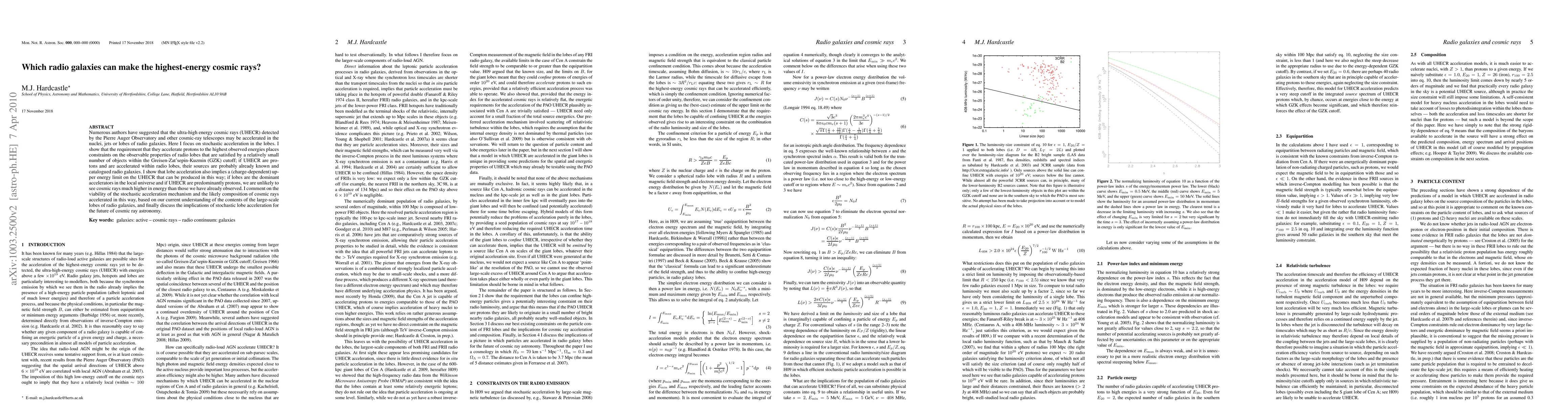 Numerous authors have suggested that the ultra-high energy cosmic rays (UHECR) detected by the Pierre Auger Observatory and other cosmic-ray telescopes may be accelerated in the nuclei, jets or lobes of radio galaxies. Here I focus on stochastic acceleration in the lobes. I show that the requirement that they accelerate protons to the highest observed energies places constraints on the observable properties of radio lobes that are satisfied by a relatively small number of objects within the Greisen-Zat'sepin-Kuzmin (GZK) cutoff; if UHECR are protons and are accelerated within radio lobes, their sources are probably already known and catalogued radio galaxies. I show that lobe acceleration also implies a (charge-dependent) upper energy limit on the UHECR that can be produced in this way; if lobes are the dominant accelerators in the local universe and if UHECR are predominantly protons, we are unlikely to see cosmic rays much higher in energy than those we have already observed. I comment on the viability of the stochastic acceleration mechanism and the likely composition of cosmic rays accelerated in this way, based on our current understanding of the contents of the large-scale lobes of radio galaxies, and finally discuss the implications of stochastic lobe acceleration for the future of cosmic ray astronomy.