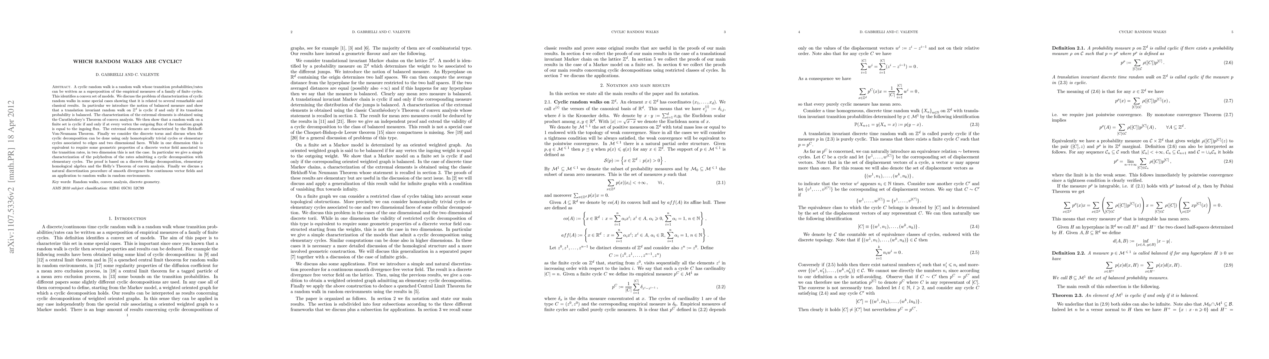 A cyclic random walk is a random walk whose transition probabilities/rates can be written as a superposition of the empirical measures of a family of finite cycles. This identifies a convex set of models. We discuss the problem of characterization of cyclic random walks in some special cases showing that it is related to several remarkable and classical results. In particular we introduce the notion of balanced measure and show that a translation invariant random walk on $\mathbb Z^d$ is cyclic if and only if its transition probability is balanced. The characterization of the extremal elements is obtained using the Carath\'{e}odory's Theorem of convex analysis. We then show that a random walk on a finite set is cyclic if and only if at every vertex the outgoing flux of the transition graph is equal to the ingoing flux. The extremal elements are characterized by the Birkhoff-Von-Neumann Theorem. Finally we consider the discrete torus and discuss when the cyclic decomposition can be done using only homotopically trivial cycles or elementary cycles associated to edges and two dimensional faces. While in one dimension this is equivalent to require some geometric properties of a discrete vector field associated to the transition rates, in two dimension this is not the case. In particular we give a simple characterization of the polyhedron of the rates admitting a cyclic decomposition with elementary cycles. The proof is based on a discrete Hodge decomposition, elementary homological algebra and the Helly's Theorem of convex analysis. Finally we discuss a natural discretization procedure of smooth divergence free continuous vector fields and an application to random walks in random environments.