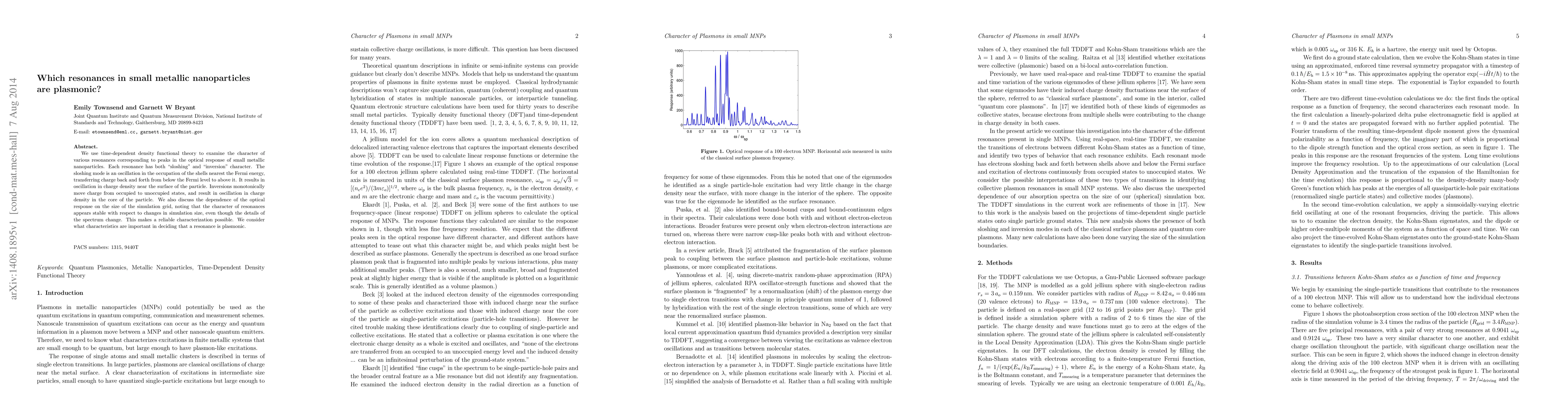 We use time-dependent density functional theory to examine the character of various resonances corresponding to peaks in the optical response of small metallic nanoparticles. Each resonance has both "sloshing" and "inversion" character. The sloshing mode is an oscillation in the occupation of the shells nearest the Fermi energy, transferring charge back and forth from below the Fermi level to above it. It results in oscillation in charge density near the surface of the particle. Inversions monotonically move charge from occupied to unoccupied states, and result in oscillation in charge density in the core of the particle. We also discuss the dependence of the optical response on the size of the simulation grid, noting that the character of resonances appears stable with respect to changes in simulation size, even though the details of the spectrum change. This makes a reliable characterization possible. We consider what characteristics are important in deciding that a resonance is plasmonic.