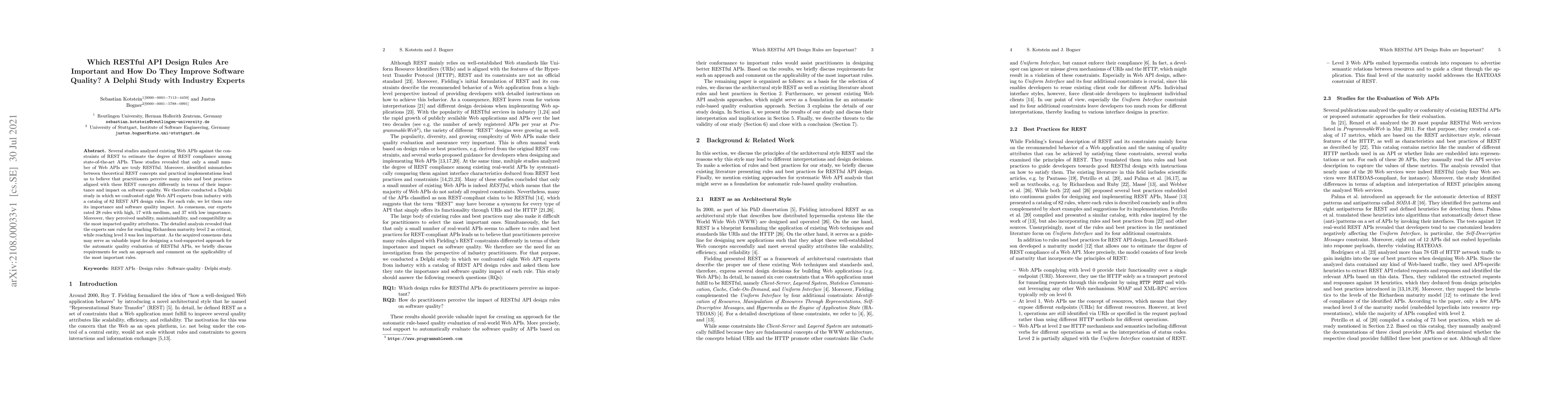 This Delphi study with industry experts identified 28 critical RESTful API design rules, 17 of medium importance, and 37 of low importance, focusing on usability, maintainability, and compatibility. Experts deemed rules for achieving Richardson maturity level 2 as crucial, while level 3 was less important.
