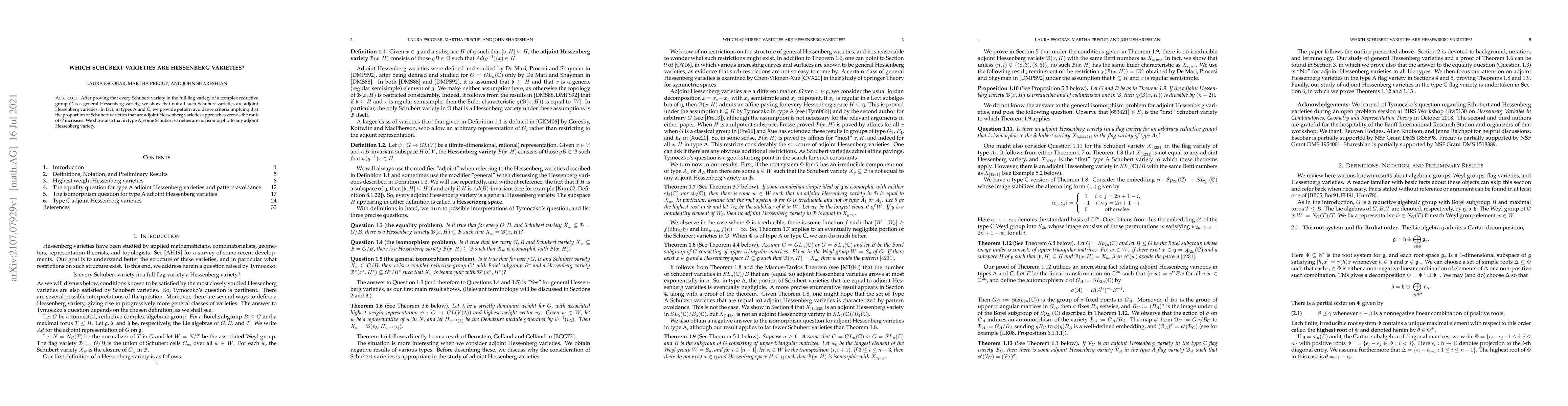 Summary: This paper proves that every Schubert variety is a general Hessenberg variety but not all are adjoint Hessenberg varieties. It provides pattern avoidance criteria showing that the proportion of adjoint Hessenberg Schubert varieties approaches zero in types A and C as group rank increases, and identifies some Schubert varieties in type A that are not isomorphic to any adjoint Hessenberg variety.