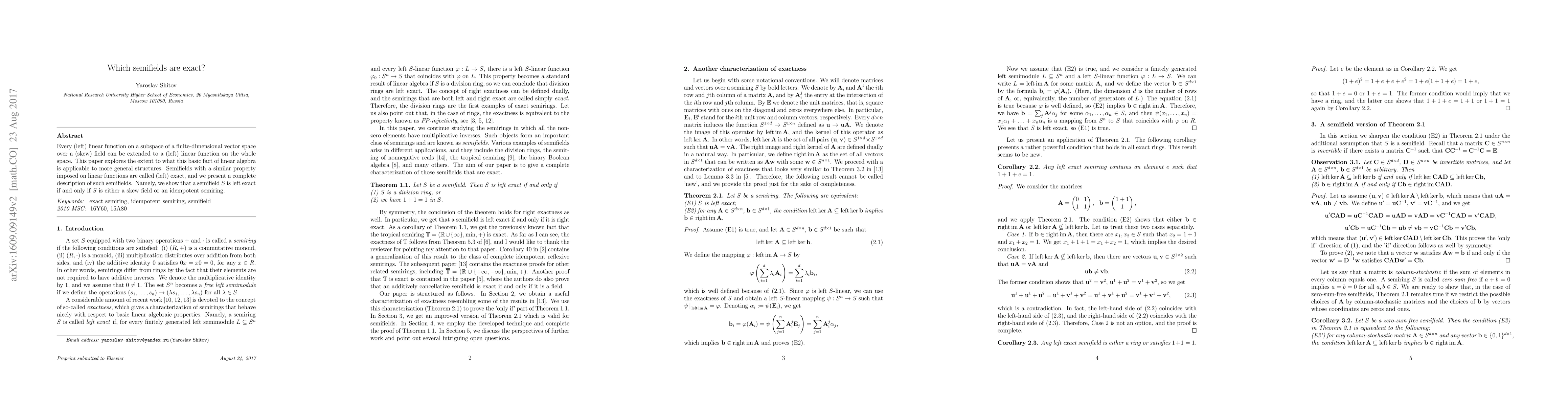 Every (left) linear function on a subspace of a finite-dimensional vector space over a (skew) field can be extended to a (left) linear function on the whole space. This paper explores the extent to what this basic fact of linear algebra is applicable to more general structures. Semifields with a similar property imposed on linear functions are called (left) exact, and we present a complete description of such semifields. Namely, we show that a semifield $S$ is left exact if and only if $S$ is either a skew field or an idempotent semiring. In particular, our result is new even for the tropical semiring and gives a solution to the problem posed by Wilding. Also, we point out several problems that require further investigation.