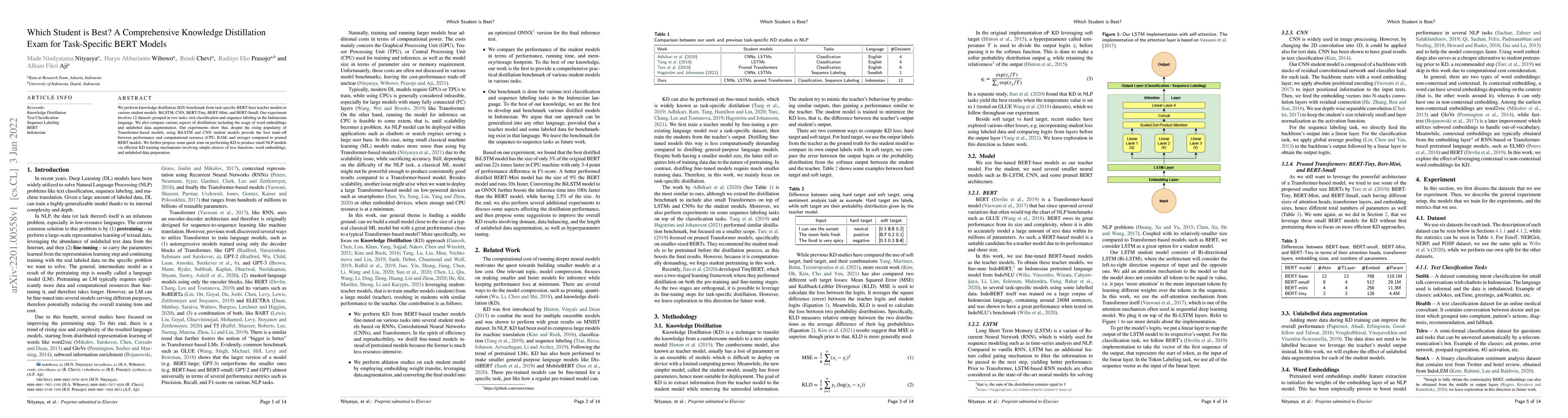 We perform knowledge distillation (KD) benchmark from task-specific BERT-base teacher models to various student models: BiLSTM, CNN, BERT-Tiny, BERT-Mini, and BERT-Small. Our experiment involves 12 datasets grouped in two tasks: text classification and sequence labeling in the Indonesian language. We also compare various aspects of distillations including the usage of word embeddings and unlabeled data augmentation. Our experiments show that, despite the rising popularity of Transformer-based models, using BiLSTM and CNN student models provide the best trade-off between performance and computational resource (CPU, RAM, and storage) compared to pruned BERT models. We further propose some quick wins on performing KD to produce small NLP models via efficient KD training mechanisms involving simple choices of loss functions, word embeddings, and unlabeled data preparation.