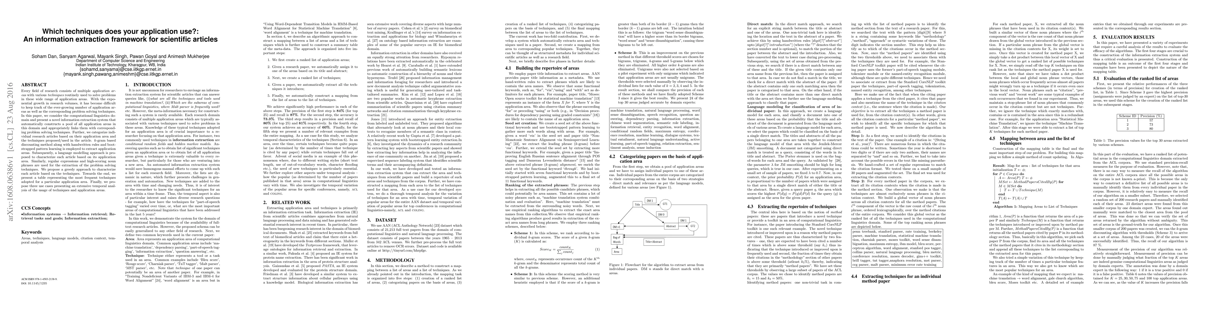 Every field of research consists of multiple application areas with various techniques routinely used to solve problems in these wide range of application areas. With the exponential growth in research volumes, it has become difficult to keep track of the ever-growing number of application areas as well as the corresponding problem solving techniques. In this paper, we consider the computational linguistics domain and present a novel information extraction system that automatically constructs a pool of all application areas in this domain and appropriately links them with corresponding problem solving techniques. Further, we categorize individual research articles based on their application area and the techniques proposed/used in the article. k-gram based discounting method along with handwritten rules and bootstrapped pattern learning is employed to extract application areas. Subsequently, a language modeling approach is proposed to characterize each article based on its application area. Similarly, regular expressions and high-scoring noun phrases are used for the extraction of the problem solving techniques. We propose a greedy approach to characterize each article based on the techniques. Towards the end, we present a table representing the most frequent techniques adopted for a particular application area. Finally, we propose three use cases presenting an extensive temporal analysis of the usage of techniques and application areas.