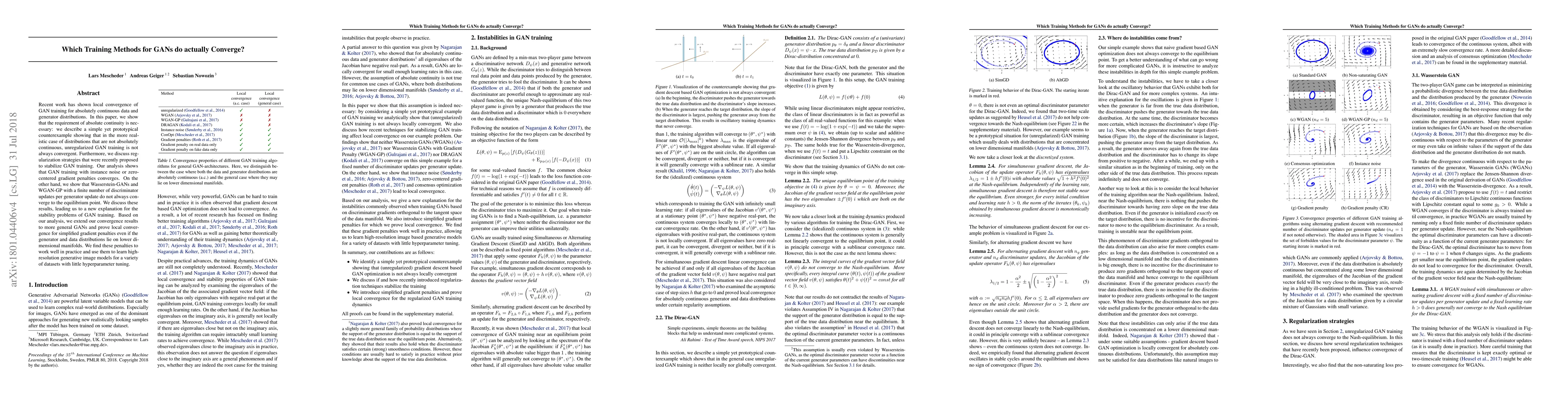 Recent work has shown local convergence of GAN training for absolutely continuous data and generator distributions. In this paper, we show that the requirement of absolute continuity is necessary: we describe a simple yet prototypical counterexample showing that in the more realistic case of distributions that are not absolutely continuous, unregularized GAN training is not always convergent. Furthermore, we discuss regularization strategies that were recently proposed to stabilize GAN training. Our analysis shows that GAN training with instance noise or zero-centered gradient penalties converges. On the other hand, we show that Wasserstein-GANs and WGAN-GP with a finite number of discriminator updates per generator update do not always converge to the equilibrium point. We discuss these results, leading us to a new explanation for the stability problems of GAN training. Based on our analysis, we extend our convergence results to more general GANs and prove local convergence for simplified gradient penalties even if the generator and data distribution lie on lower dimensional manifolds. We find these penalties to work well in practice and use them to learn high-resolution generative image models for a variety of datasets with little hyperparameter tuning.
