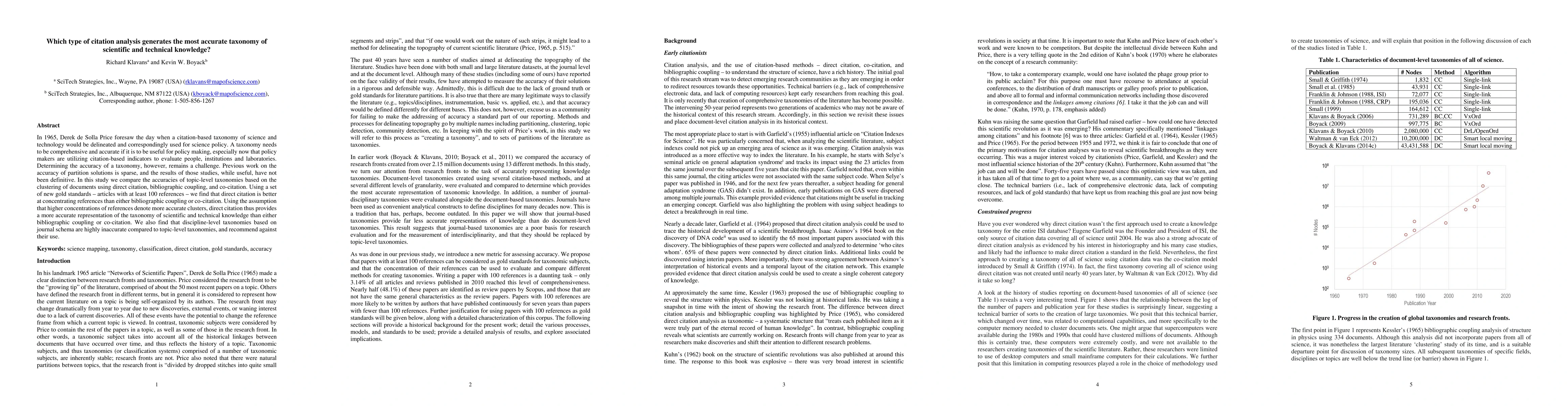 This study finds that direct citation analysis produces a more accurate taxonomy of scientific knowledge than bibliographic coupling or co-citation methods. It recommends using topic-level taxonomies over discipline-level ones.