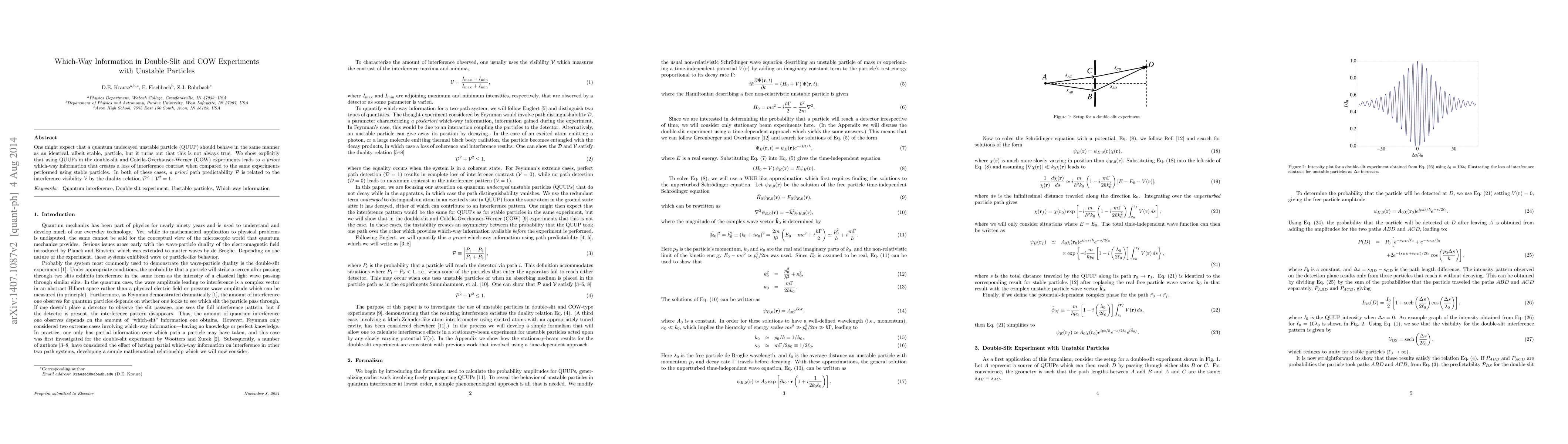 This paper demonstrates that using quantum undecayed unstable particles (QUUPs) in double-slit and COW experiments results in a loss of interference contrast due to a priori which-way information, contrasting with the behavior of stable particles. The study reveals a duality relation between path predictability and interference visibility.