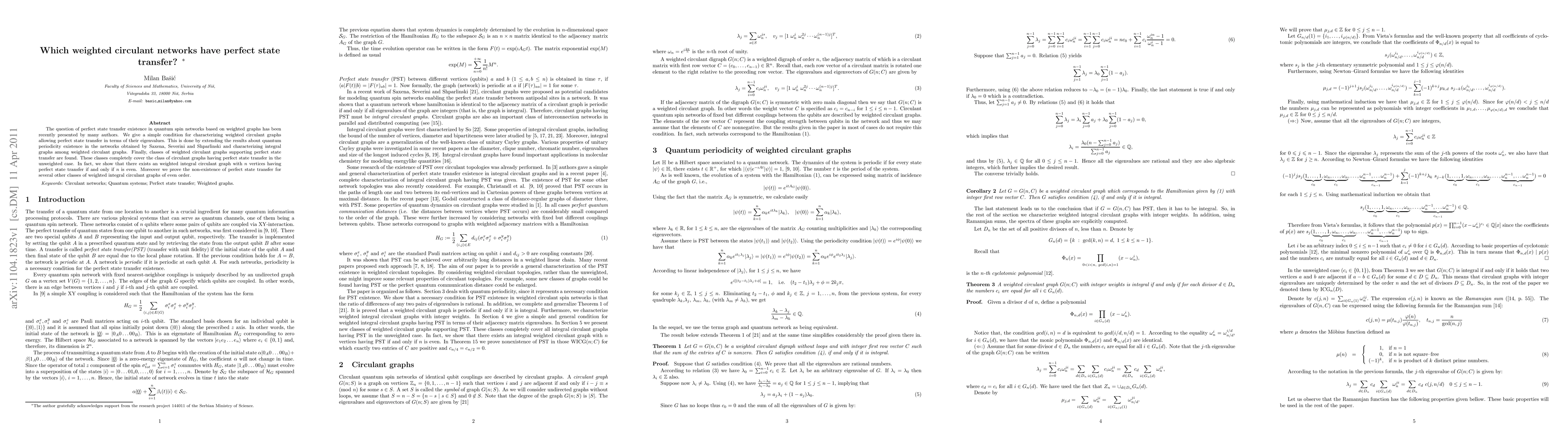 This paper identifies conditions for weighted circulant graphs to achieve perfect state transfer, showing that such graphs exist if and only if the number of vertices is even. It extends previous findings on quantum periodicity and characterizes integral graphs among weighted circulant graphs.