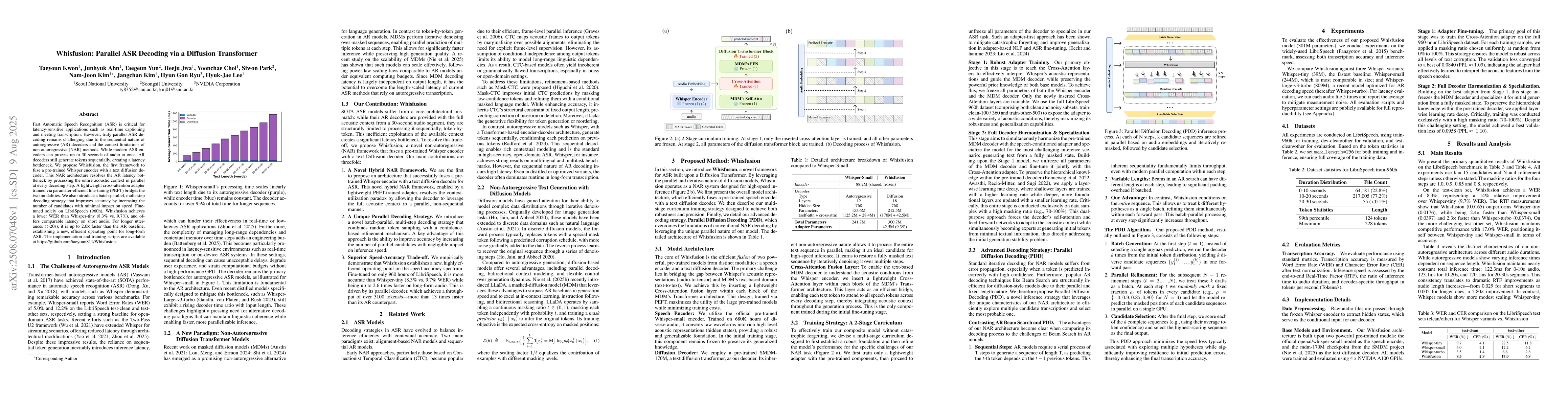 Whisfusion introduces a novel framework that fuses a pre-trained Whisper encoder with a non-autoregressive text diffusion decoder, using a lightweight cross-attention adapter and a batch-parallel, multi-step decoding strategy to resolve the AR latency bottleneck.