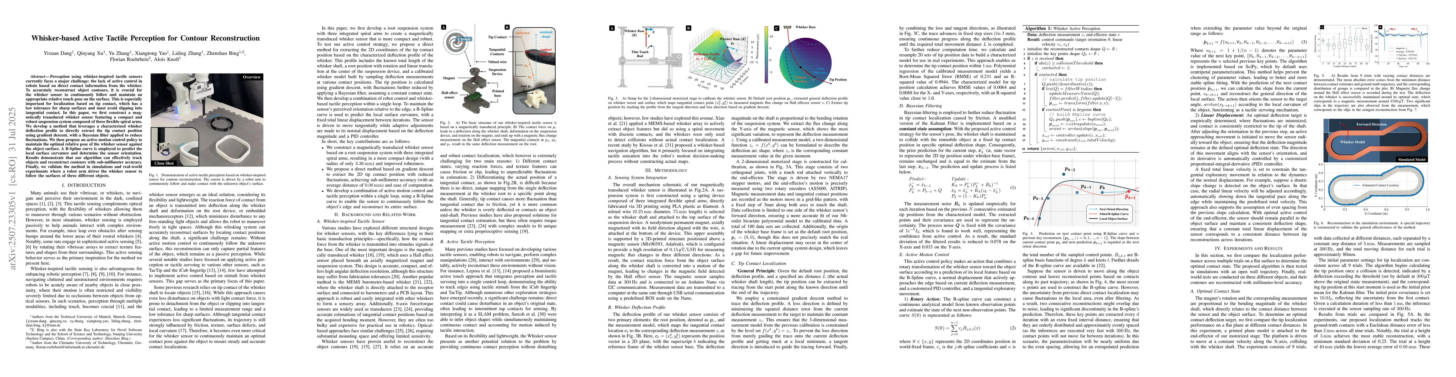 Perception using whisker-inspired tactile sensors currently faces a major challenge: the lack of active control in robots based on direct contact information from the whisker. To accurately reconstruct object contours, it is crucial for the whisker sensor to continuously follow and maintain an appropriate relative touch pose on the surface. This is especially important for localization based on tip contact, which has a low tolerance for sharp surfaces and must avoid slipping into tangential contact. In this paper, we first construct a magnetically transduced whisker sensor featuring a compact and robust suspension system composed of three flexible spiral arms. We develop a method that leverages a characterized whisker deflection profile to directly extract the tip contact position using gradient descent, with a Bayesian filter applied to reduce fluctuations. We then propose an active motion control policy to maintain the optimal relative pose of the whisker sensor against the object surface. A B-Spline curve is employed to predict the local surface curvature and determine the sensor orientation. Results demonstrate that our algorithm can effectively track objects and reconstruct contours with sub-millimeter accuracy. Finally, we validate the method in simulations and real-world experiments where a robot arm drives the whisker sensor to follow the surfaces of three different objects.