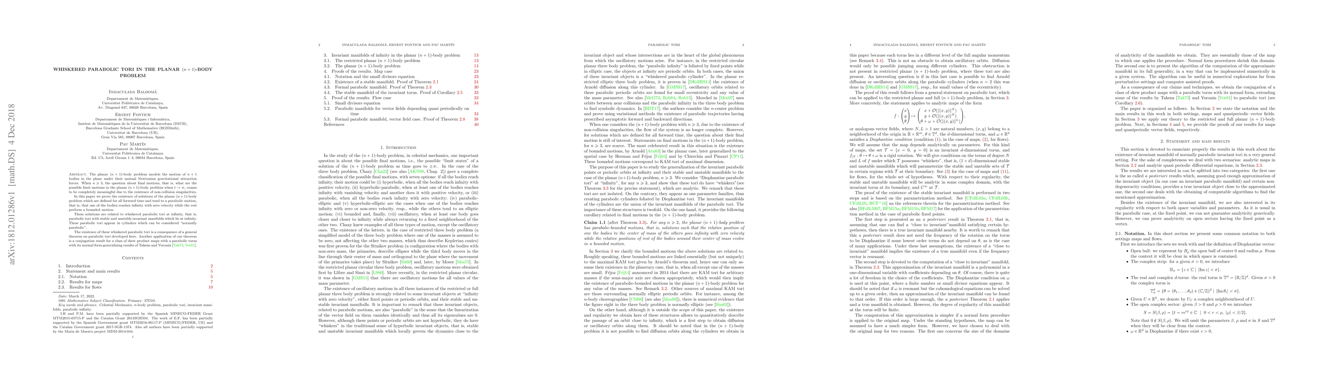 The planar $(n+1)$-body problem models the motion of $n+1$ bodies in the plane under their mutual Newtonian gravitational attraction forces. When $n\ge 3$, the question about final motions, that is, what are the possible limit motions in the planar $(n+1)$-body problem when $t\to \infty$, ceases to be completely meaningful due to the existence of non-collision singularities. In this paper we prove the existence of solutions of the planar $(n+1)$-body problem which are defined for all forward time and tend to a parabolic motion, that is, that one of the bodies reaches infinity with zero velocity while the rest perform a bounded motion. These solutions are related to whiskered parabolic tori at infinity, that is, parabolic tori with stable and unstable invariant manifolds which lie at infinity. These parabolic tori appear in cylinders which can be considered `normally parabolic'. The existence of these whiskered parabolic tori is a consequence of a general theorem on parabolic tori developed here. Another application of our theorem is a conjugation result for a class of skew product maps with a parabolic torus with its normal form generalizing results of Takens and Voronin.