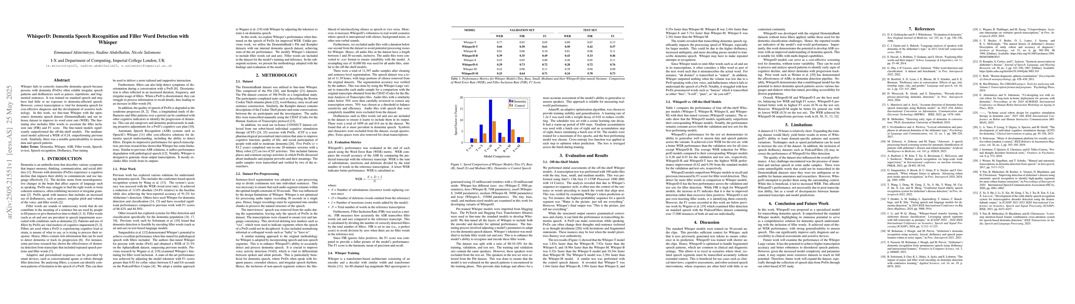 This work distinguishes itself by focusing on fine-tuning Whisper for dementia speech, an under-explored area, and by evaluating filler word detection alongside WER improvements.