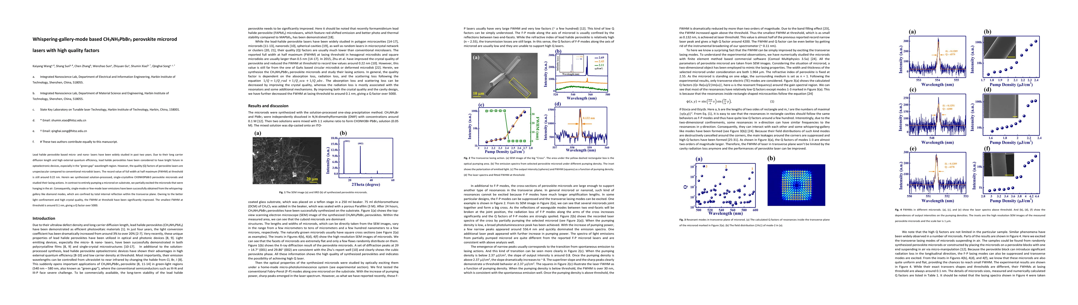 This paper reports the synthesis of single-crystalline CH3NH3PbBr3 perovskite microrods and demonstrates their whispering-gallery-mode laser action, achieving high quality factors (Q > 5000) and a narrow linewidth of 0.1 nm by partially exciting the microrods in air, leading to improved light confinement.