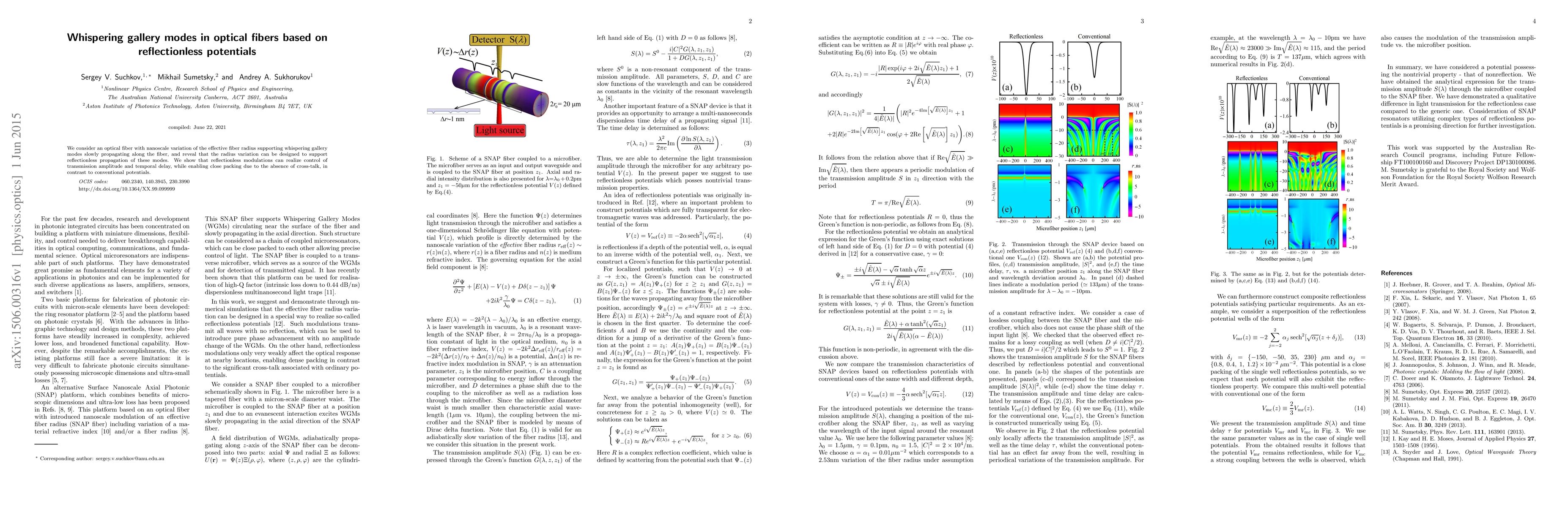 This paper explores optical fibers with nanoscale radius variations that support whispering gallery modes, demonstrating reflectionless propagation. Such modulations enable precise control over transmission amplitude and delay, and allow for closely packed modes without cross-talk.