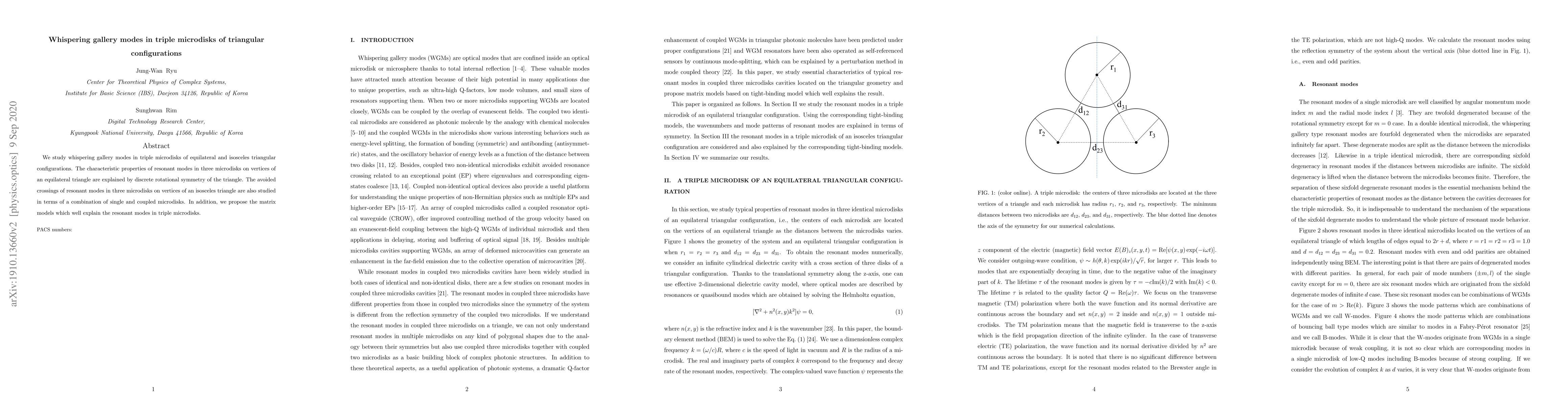 We study whispering gallery modes in triple microdisks of equilateral and isosceles triangular configurations. The characteristic properties of resonant modes in three microdisks on vertices of an equilateral triangle are explained by discrete rotational symmetry of the triangle. The avoided crossings of resonant modes in three microdisks on vertices of an isosceles triangle are also studied in terms of a combination of single and coupled microdisks. Finally, we propose the matrix models which well explain the resonant modes in triple microdisks.