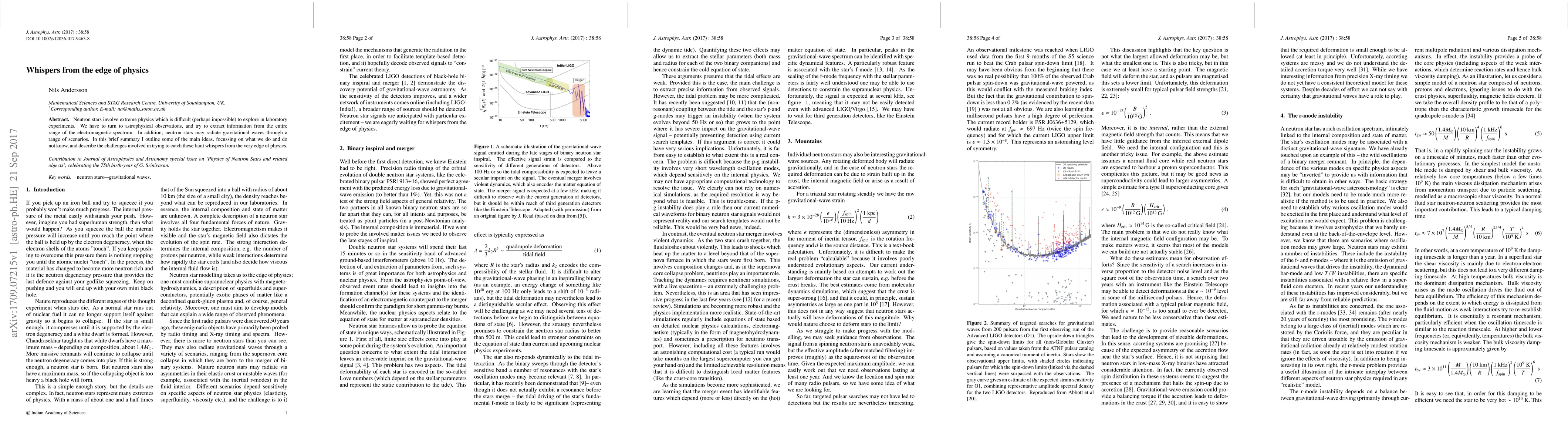 Neutron stars involve extreme physics which is difficult (perhaps impossible) to explore in laboratory experiments. We have to turn to astrophysical observations, and try to extract information from the entire range of the electromagnetic spectrum. In addition, neutron stars may radiate gravitational waves through a range of scenarios. In this brief summary I outline some of the main ideas, focussing on what we do and do not know, and describe the challenges involved in trying to catch these faint whispers from the very edge of physics.