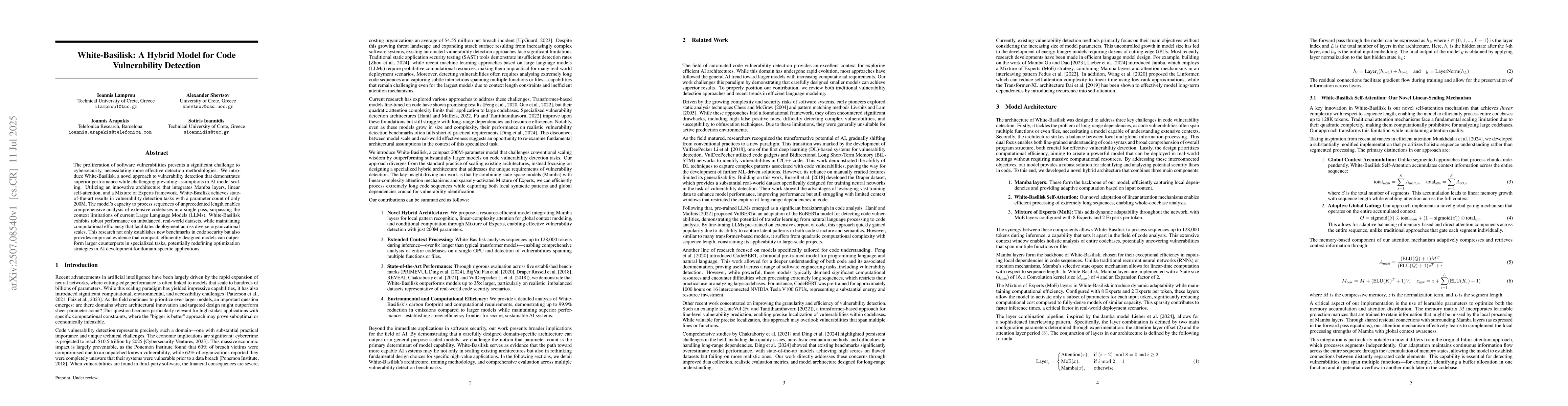 The proliferation of software vulnerabilities presents a significant challenge to cybersecurity, necessitating more effective detection methodologies. We introduce White-Basilisk, a novel approach to vulnerability detection that demonstrates superior performance while challenging prevailing assumptions in AI model scaling. Utilizing an innovative architecture that integrates Mamba layers, linear self-attention, and a Mixture of Experts framework, White-Basilisk achieves state-of-the-art results in vulnerability detection tasks with a parameter count of only 200M. The model's capacity to process sequences of unprecedented length enables comprehensive analysis of extensive codebases in a single pass, surpassing the context limitations of current Large Language Models (LLMs). White-Basilisk exhibits robust performance on imbalanced, real-world datasets, while maintaining computational efficiency that facilitates deployment across diverse organizational scales. This research not only establishes new benchmarks in code security but also provides empirical evidence that compact, efficiently designed models can outperform larger counterparts in specialized tasks, potentially redefining optimization strategies in AI development for domain-specific applications.