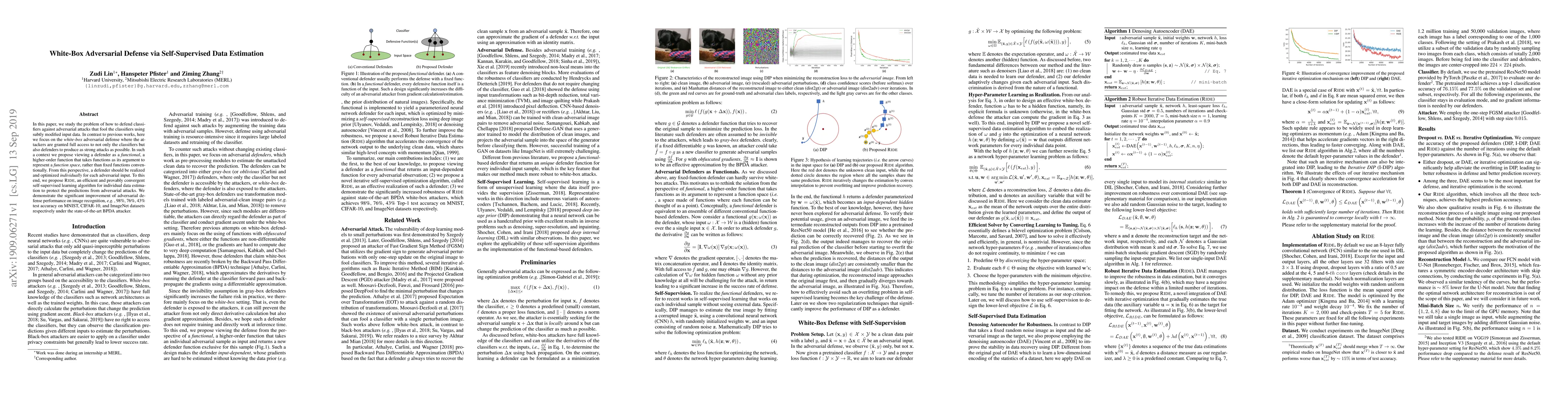In this paper, we study the problem of how to defend classifiers against adversarial attacks that fool the classifiers using subtly modified input data. In contrast to previous works, here we focus on the white-box adversarial defense where the attackers are granted full access to not only the classifiers but also defenders to produce as strong attacks as possible. In such a context we propose viewing a defender as a functional, a higher-order function that takes functions as its argument to represent a function space, rather than fixed functions conventionally. From this perspective, a defender should be realized and optimized individually for each adversarial input. To this end, we propose RIDE, an efficient and provably convergent self-supervised learning algorithm for individual data estimation to protect the predictions from adversarial attacks. We demonstrate the significant improvement of adversarial defense performance on image recognition, eg, 98%, 76%, 43% test accuracy on MNIST, CIFAR-10, and ImageNet datasets respectively under the state-of-the-art BPDA attacker.