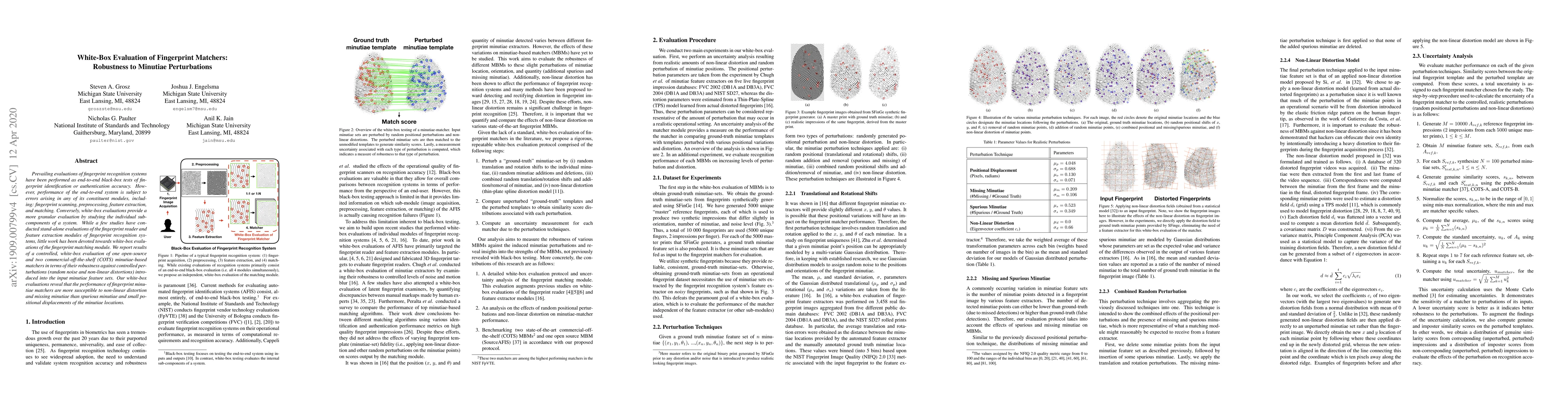 The paper presents a white-box evaluation of open-source and commercial fingerprint matchers, focusing on their robustness to minutiae perturbations, including random noise and non-linear distortions.