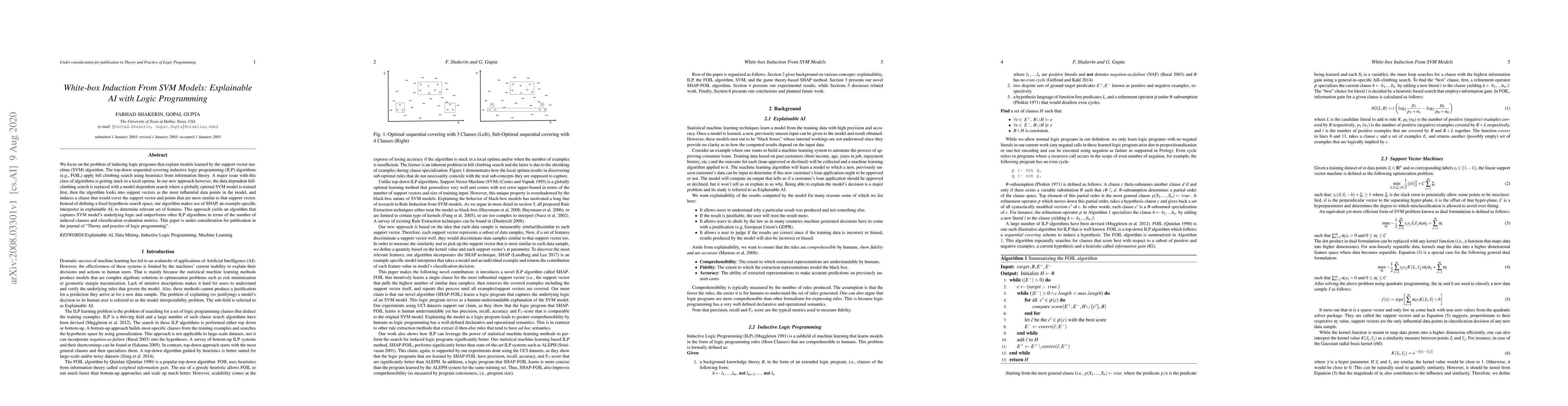 We focus on the problem of inducing logic programs that explain models learned by the support vector machine (SVM) algorithm. The top-down sequential covering inductive logic programming (ILP) algorithms (e.g., FOIL) apply hill-climbing search using heuristics from information theory. A major issue with this class of algorithms is getting stuck in a local optimum. In our new approach, however, the data-dependent hill-climbing search is replaced with a model-dependent search where a globally optimal SVM model is trained first, then the algorithm looks into support vectors as the most influential data points in the model, and induces a clause that would cover the support vector and points that are most similar to that support vector. Instead of defining a fixed hypothesis search space, our algorithm makes use of SHAP, an example-specific interpreter in explainable AI, to determine a relevant set of features. This approach yields an algorithm that captures SVM model's underlying logic and outperforms %GG: the FOIL algorithm --> other ILP algorithms other ILP algorithms in terms of the number of induced clauses and classification evaluation metrics. This paper is under consideration for publication in the journal of "Theory and practice of logic programming".