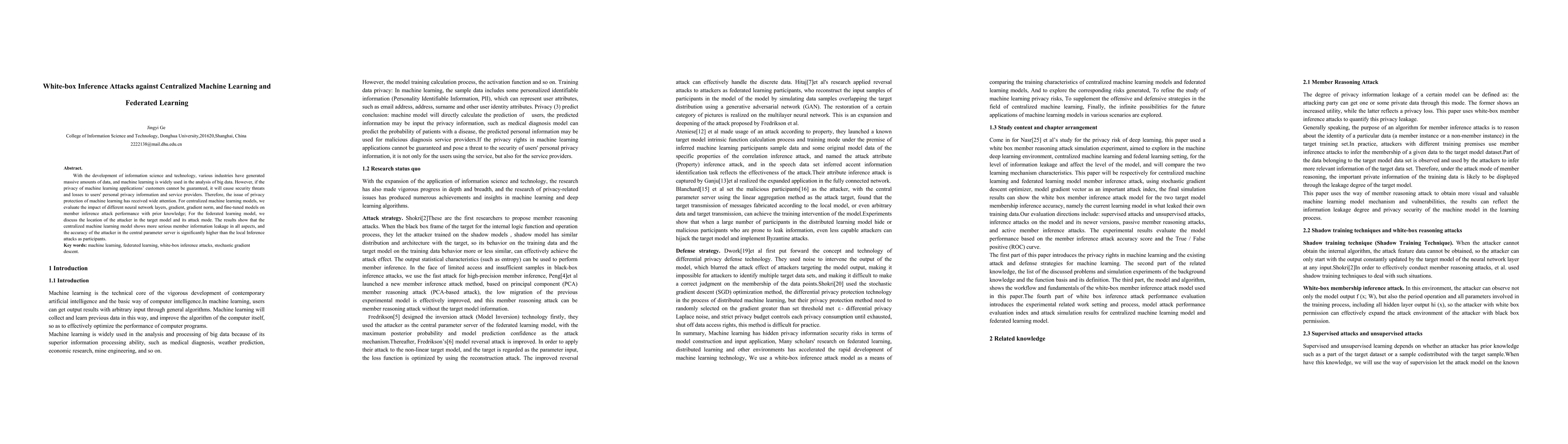 This paper investigates white-box inference attacks on both centralized and federated machine learning models, focusing on the impact of various factors on attack success. It finds that centralized models are more vulnerable to member information leakage compared to federated models, with higher accuracy in attacks targeting the central parameter server.