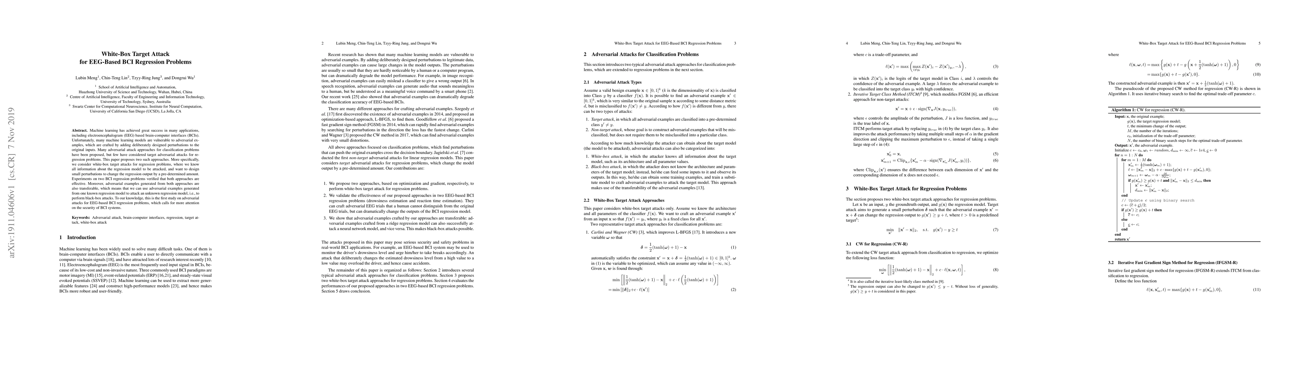 Researchers developed two white-box target attack approaches for EEG-based brain-computer interfaces, showing that adversarial examples can change regression output by a predetermined amount, posing security risks to BCI systems.