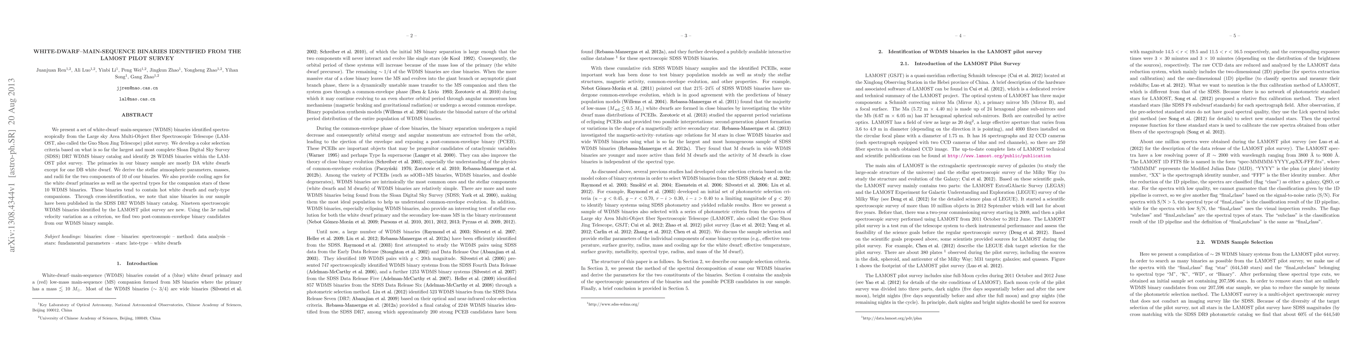 This paper identifies 28 WDMS binaries from the LAMOST pilot survey, utilizing a color selection criteria based on the SDSS DR7 catalog. Nine of these binaries are previously published, while 19 are new discoveries, including two post-common-envelope binary candidates.