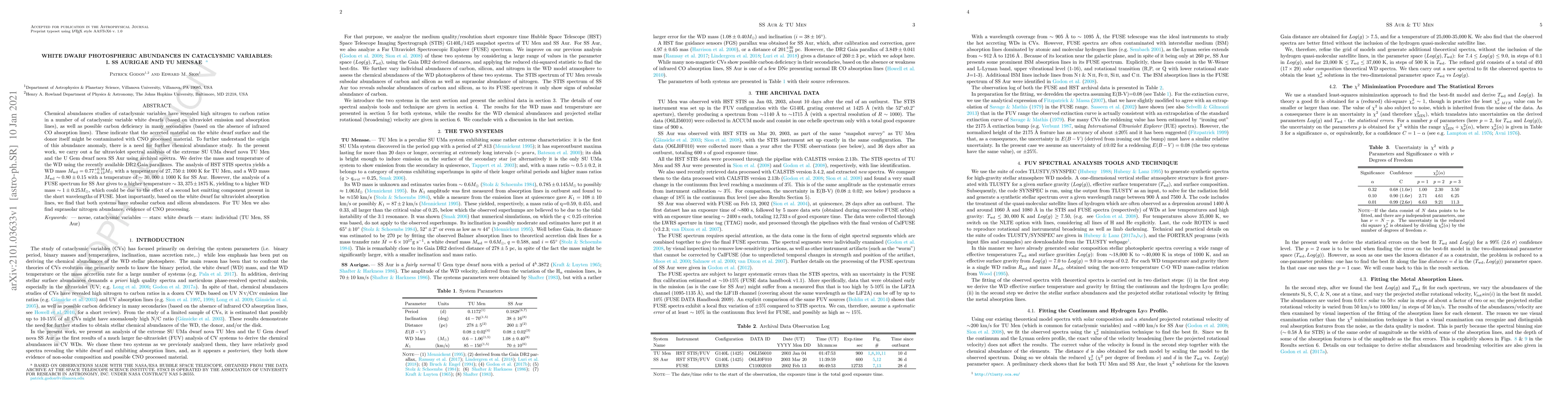 This study analyzes the photospheric abundances of white dwarfs in cataclysmic variables SS Aurigae and TU Mensae, revealing subsolar carbon and silicon levels and suprasolar nitrogen in TU Mensae, suggesting CNO processing. The derived masses and temperatures indicate potential anomalies in SS Aurigae due to a second hot emitting component.